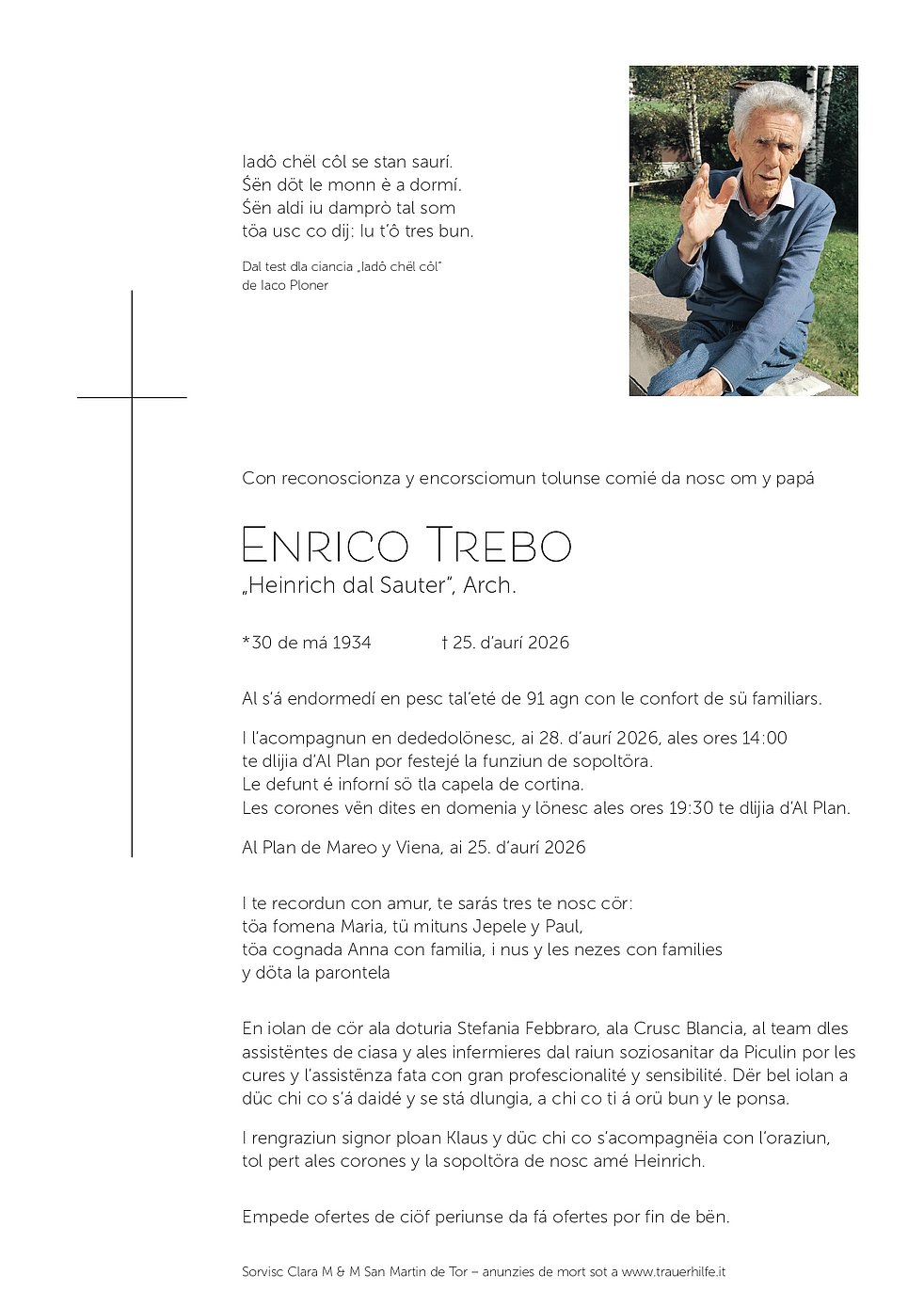 Na löm sön osc ultimo iade, palsede tla pêsc dal Signur, sontides condolianzes!