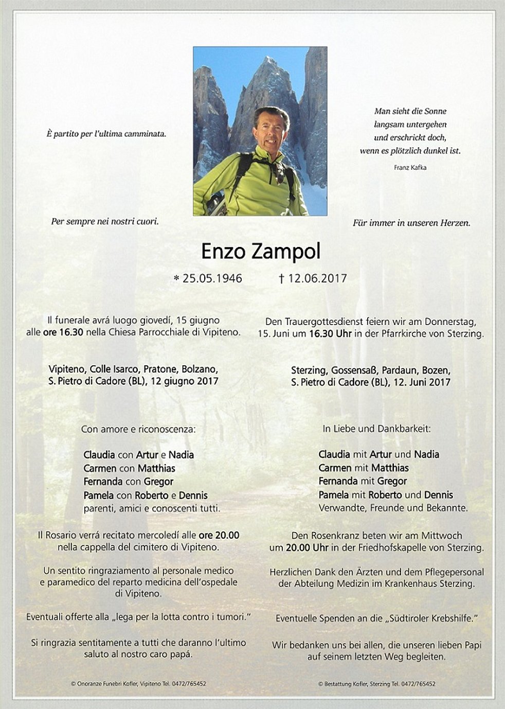 Den Trauergottesdienst feiern wir am Donnerstag, 15. Juni um 16.30 Uhr in der Pfarrkirche von Sterzing.