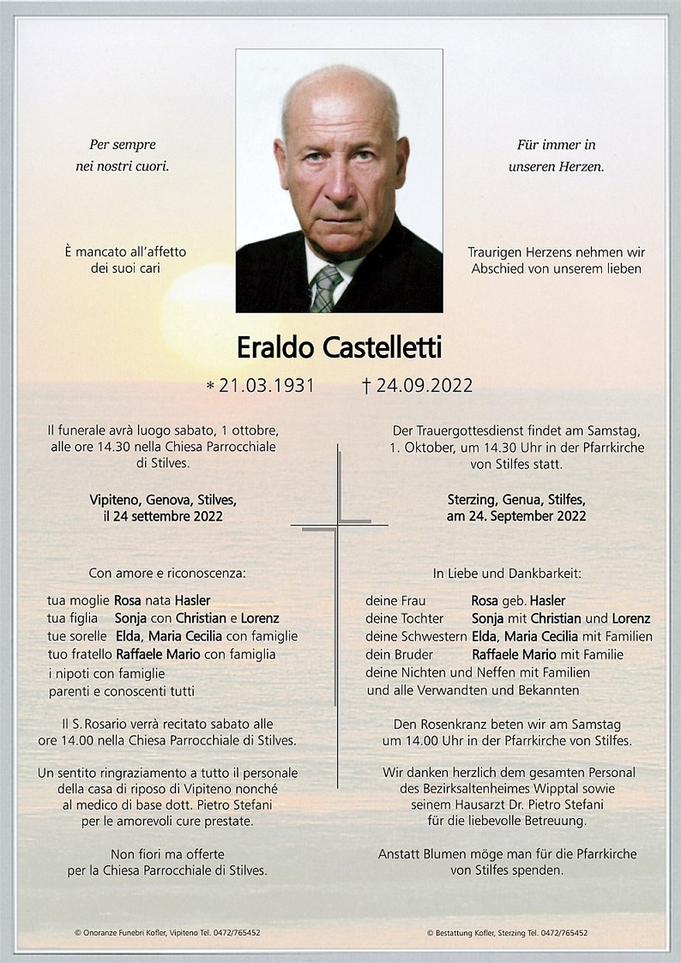 Il funerale avrà luogo sabato, 1 ottobre, alle ore 14.30 nella Chiesa Parrocchiale di Stilves.