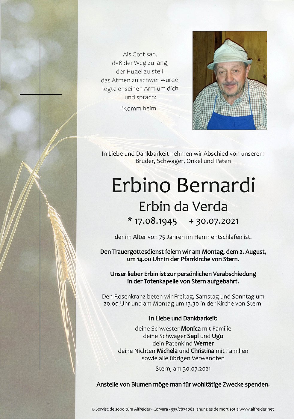 Den Trauergottesdienst feiern wir am Montag, dem 2. August, um 14.00 Uhr in der Pfarrkirche von Stern.