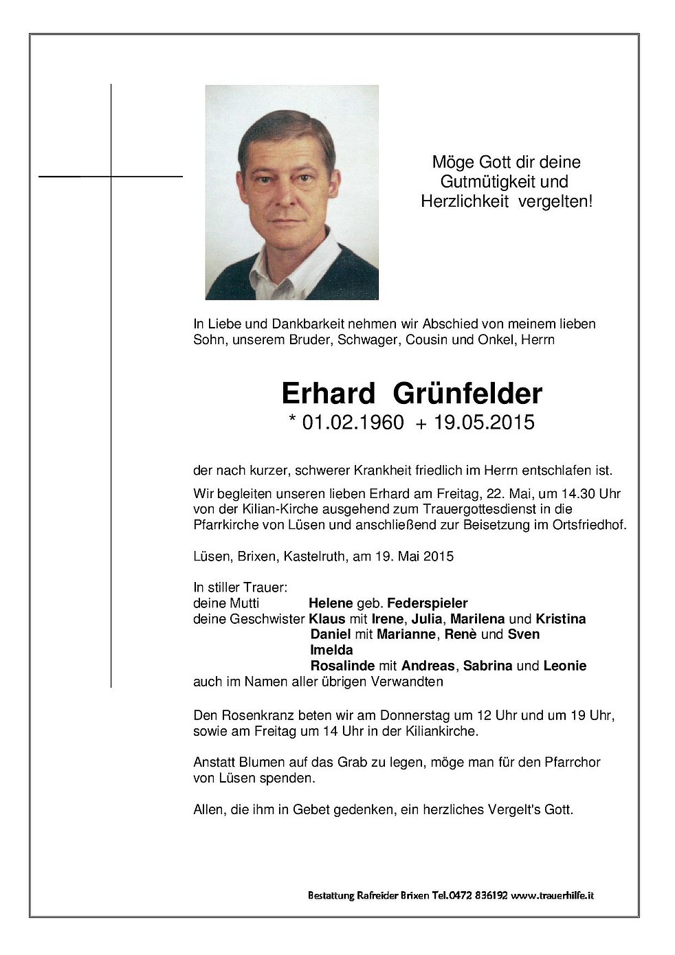 Wir begleiten unseren lieben Erhard am Freitag, 22. Mai, um 14.30 Uhr von der Kilian-Kirche ausgehend zum Trauergottesdienst in die Pfarrkirche von Lüsen und anschließend zur Beisetzung im Ortsfriedhof.