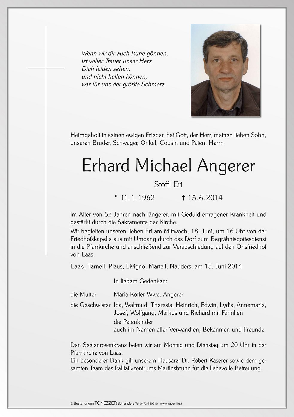 Wir begleiten unseren lieben Eri am Mittwoch, 18. Juni, um 16 Uhr von der Friedhofskapelle aus mit Umgang durch das Dorf zum Begräbnisgottesdienst in die Pfarrkirche und anschließend zur Verabschiedung auf den Ortsfriedhof von Laas.