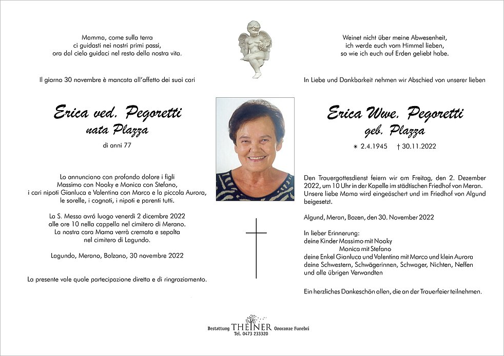 La S. Messa avrá luogo venerdì 2 dicembre 2022 alle ore 10 nella cappella nel cimitero di Merano.