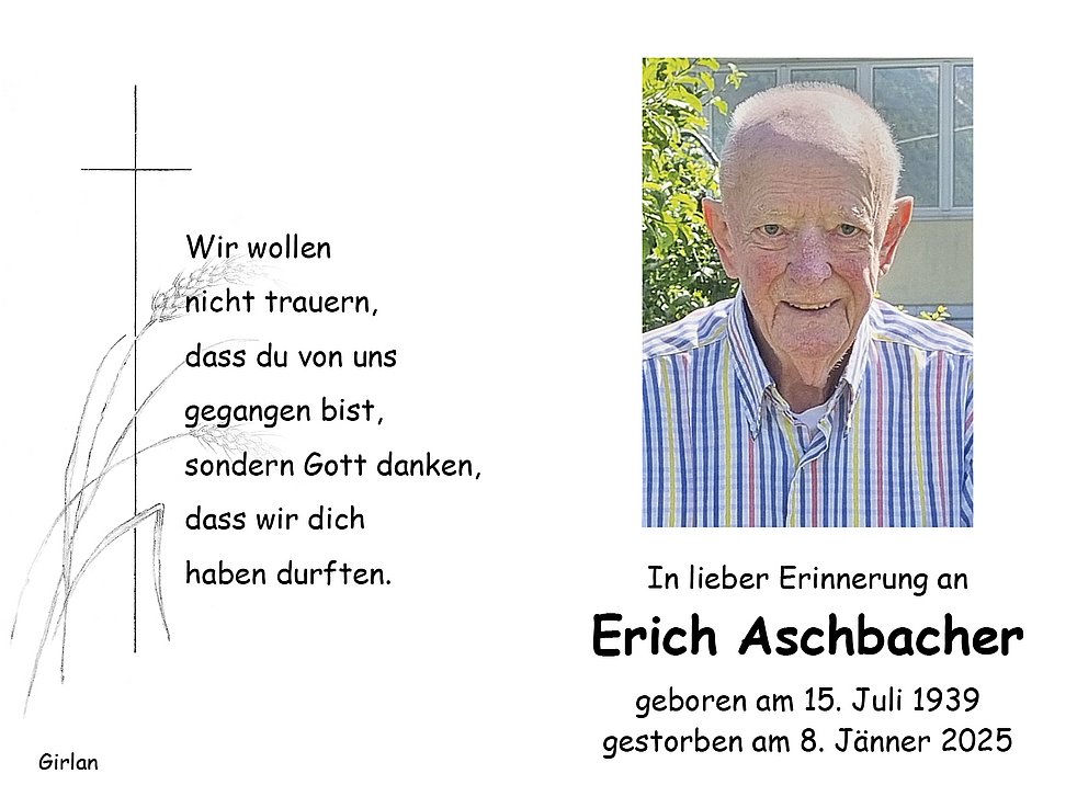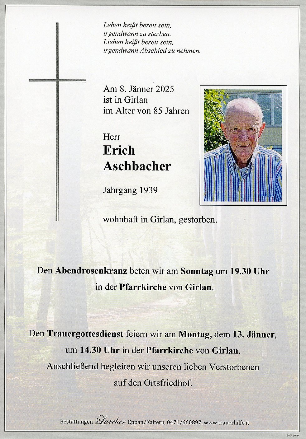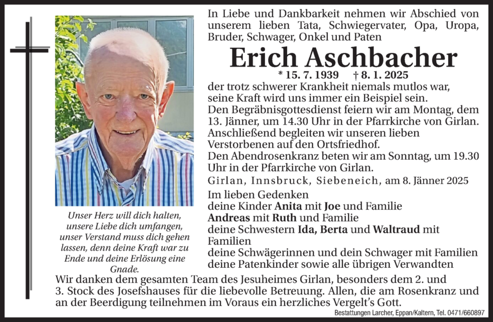 Den Begräbnisgottesdienst feiern wir am Montag, dem 13. Jänner um 14.30 Uhr in der Pfarrkirche von Girlan. Anschließend begleiten wir unseren lieben Verstorbenen auf den Ortsfriedhof. Den Abendrosenkranz beten wir am Sonntag um 19.30 Uhr in der Pfarrkirche von Girlan.