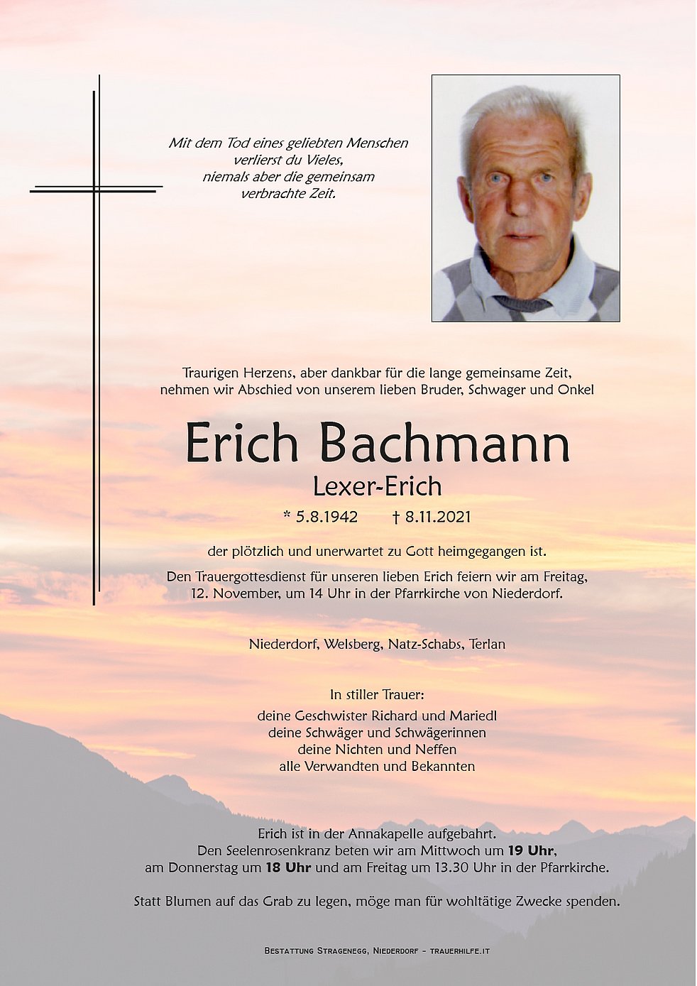 Den Trauergottesdienst für unseren lieben Erich feiern wir am Freitag, 12. November, um 14 Uhr in der Pfarrkirche von Niederdorf.