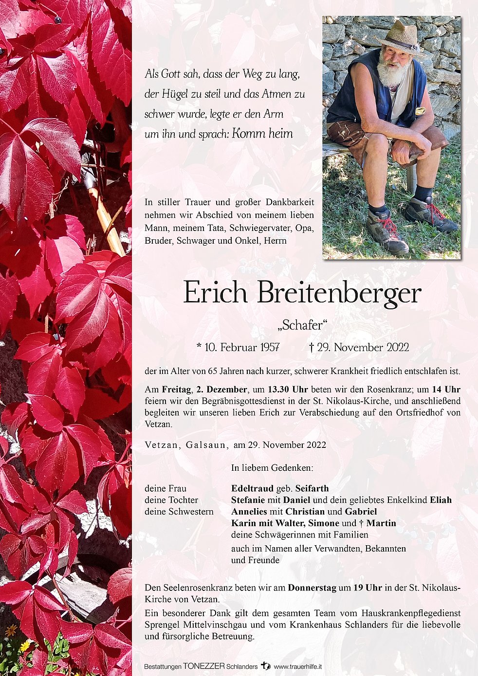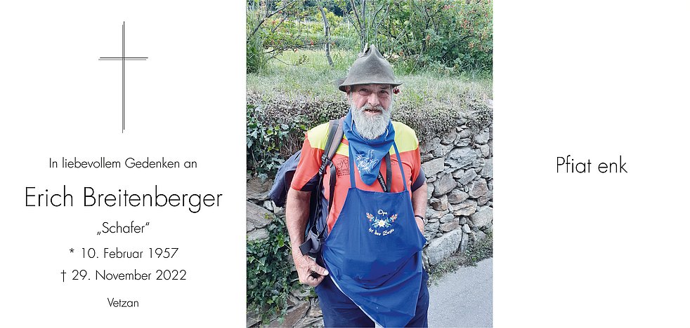 Am Freitag, 2. Dezember, um 13.30 Uhr beten wir den Rosenkranz; um 14 Uhr feiern wir den Begräbnisgottesdienst in der St. Nikolaus-Kirche, und anschließend begleiten wir unseren lieben Erich zur Verabschiedung auf den Ortsfriedhof von Vetzan.