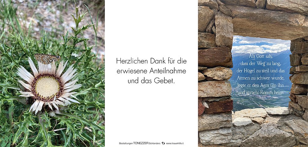 Ein besonderer Dank gilt dem gesamten Team vom Hauskrankenpflegedienst Sprengel Mittelvinschgau und vom Krankenhaus Schlanders für die liebevolle und fürsorgliche Betreuung.