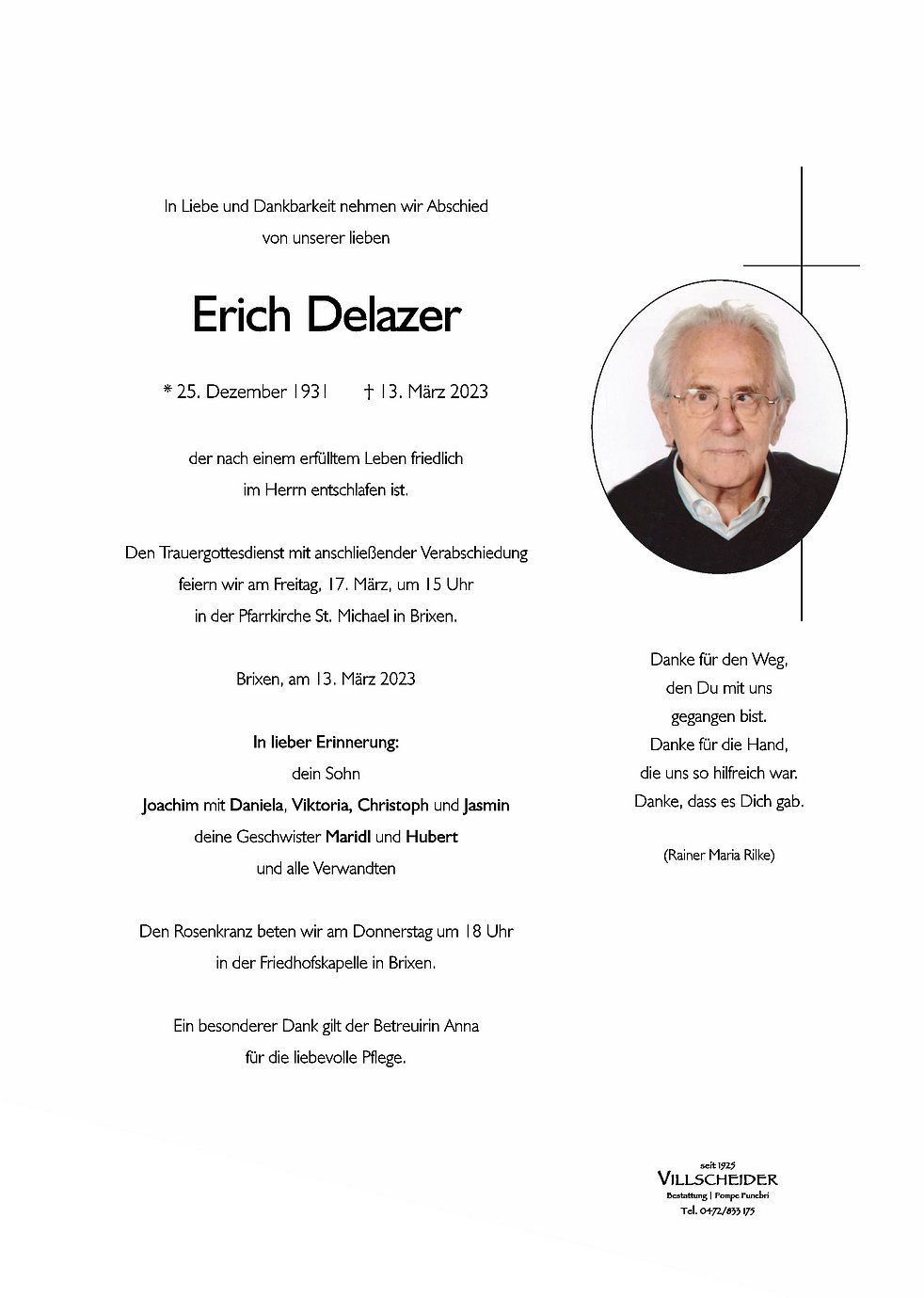 Begräbnisgottesdienst: 17.03. - 15:00 Uhr Brixen