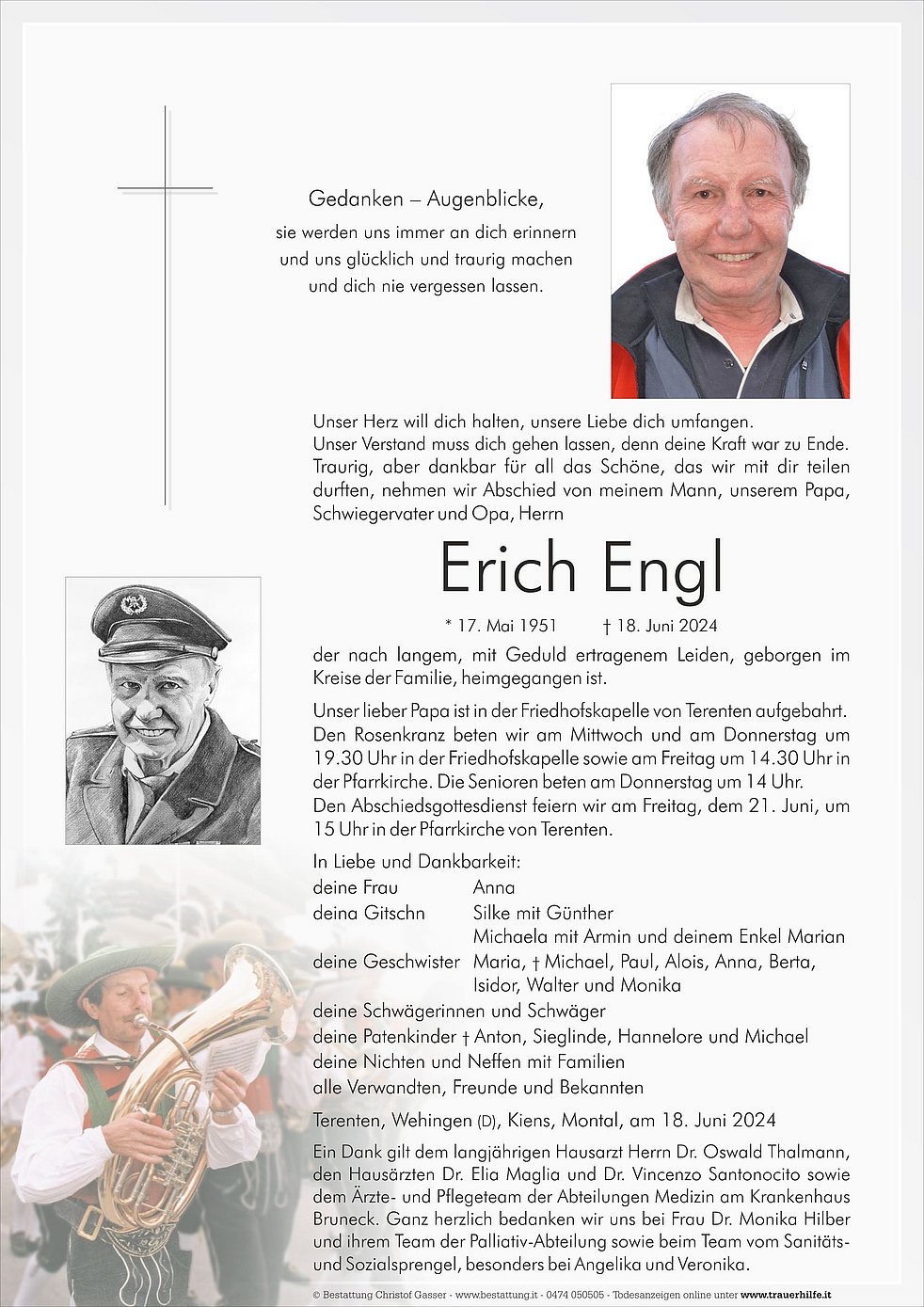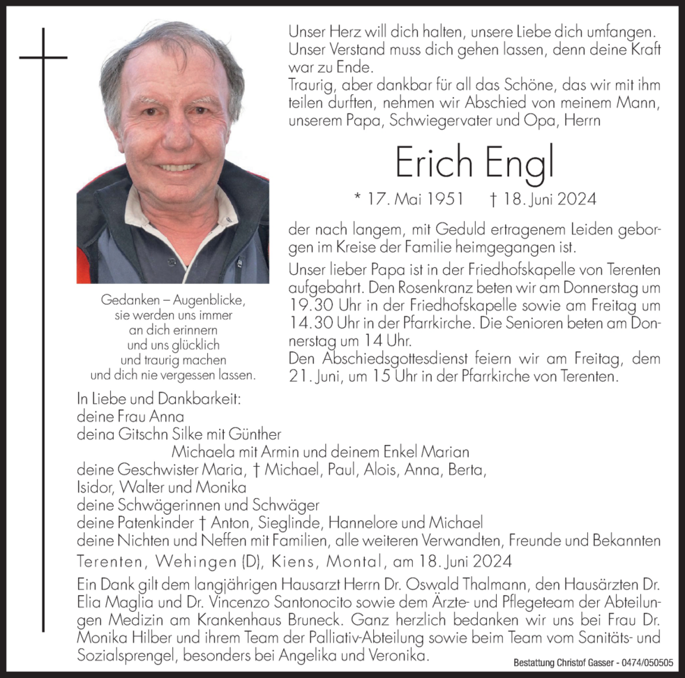 Ein Dank gilt dem langjährigen Hausarzt Herrn Dr. Oswald Thalmann, den Hausärzten Dr. Elia Maglia und Dr. Vincenzo Santonocito sowie dem Ärzte- und Pflegeteam der Abteilungen Medizin am Krankenhaus Bruneck. Ganz herzlich bedanken wir uns bei Frau Dr. Monika Hilber und ihrem Team der Palliativ-Abteilung sowie beim Team vom Sanitäts- und Sozialsprengel, besonders bei Angelika und Veronika.