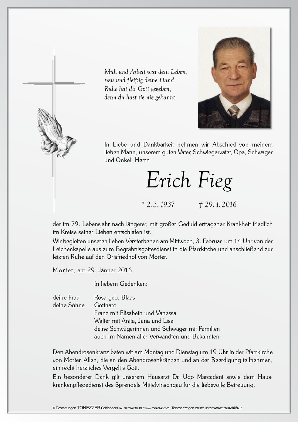 Wir begleiten unseren lieben Verstorbenen am Mittwoch, 3. Februar, um 14 Uhr von der Leichenkapelle aus zum Begräbnisgottesdienst in die Pfarrkirche und anschließend zur letzten Ruhe auf den Ortsfriedhof von Morter.