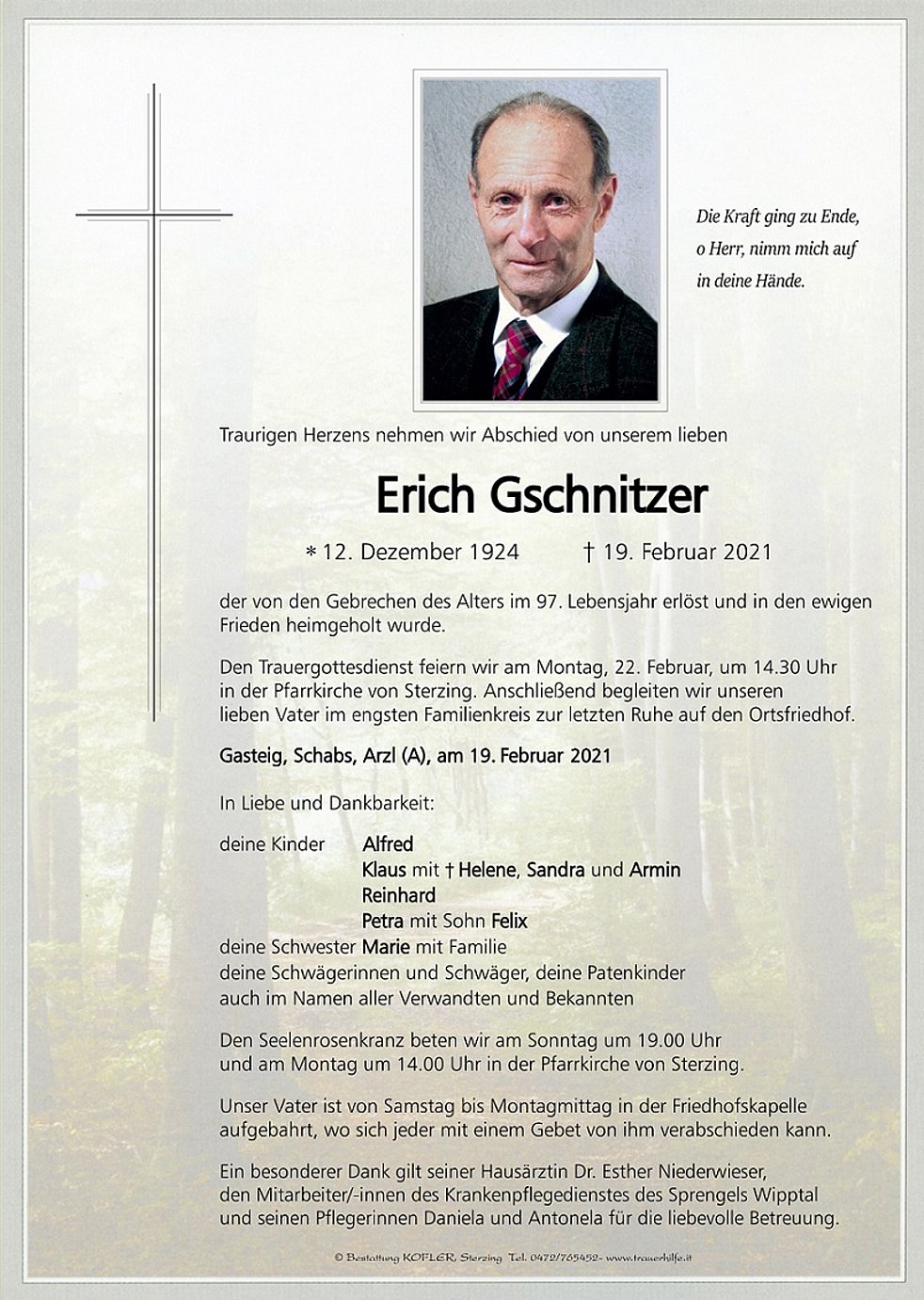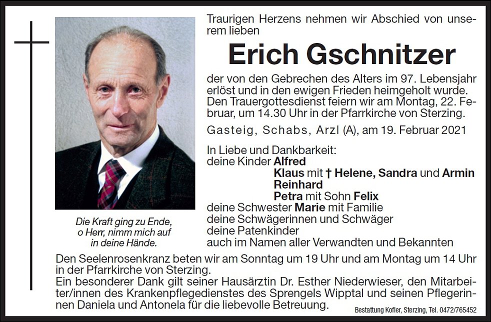 Den Trauergottesdienst feiern wir am Montag, 22. Februar, um 14.30 Uhr in der Pfarrkirche von Sterzing. Anschließend begleiten wir unseren lieben Vater im engsten Familienkreis zur letzten Ruhe auf den Ortsfriedhof.