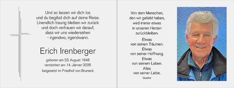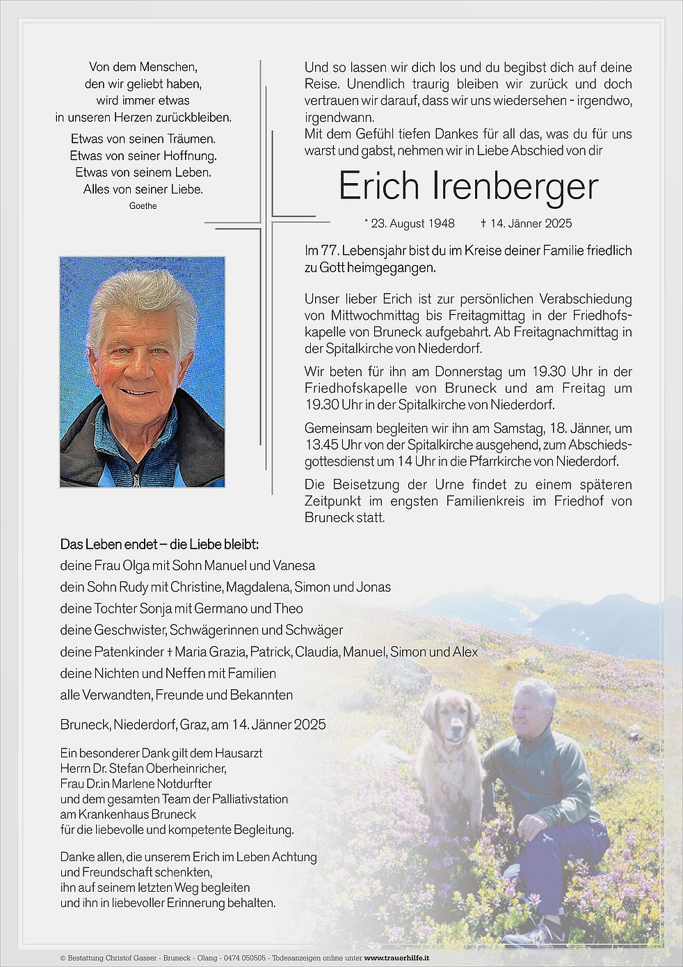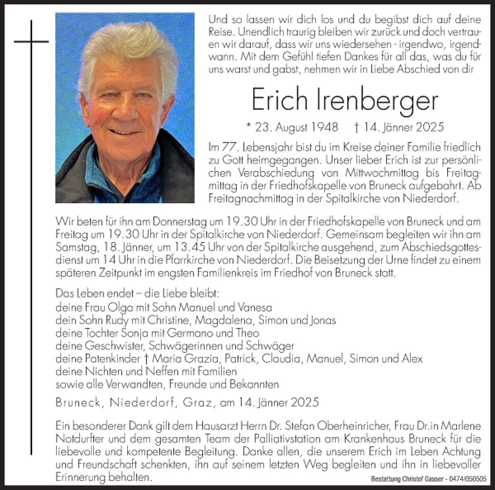 Unser lieber Erich ist zur persönlichen Verabschiedung von Mittwochmittag bis Freitagmittag in der Friedhofskapelle von Bruneck aufgebahrt. Ab Freitagnachmittag in der Spitalkirche von Niederdorf.