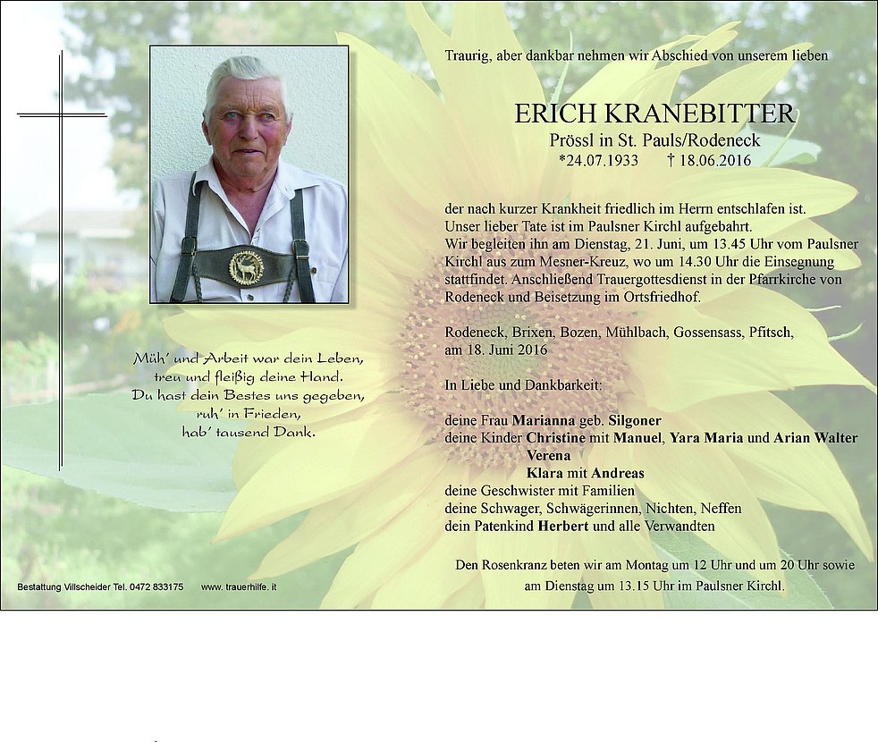 Wir begleiten ihn am Dienstag, 21. Juni, um 13.45 Uhr vom Paulsner Kirchl aus zum Mesner-Kreuz, wo um 14.30 Uhr die Einsegnung stattfindet. Anschließend Trauergottesdienst in der Pfarrkirche von Rodeneck und Beisetzung im Ortsfriedhof.