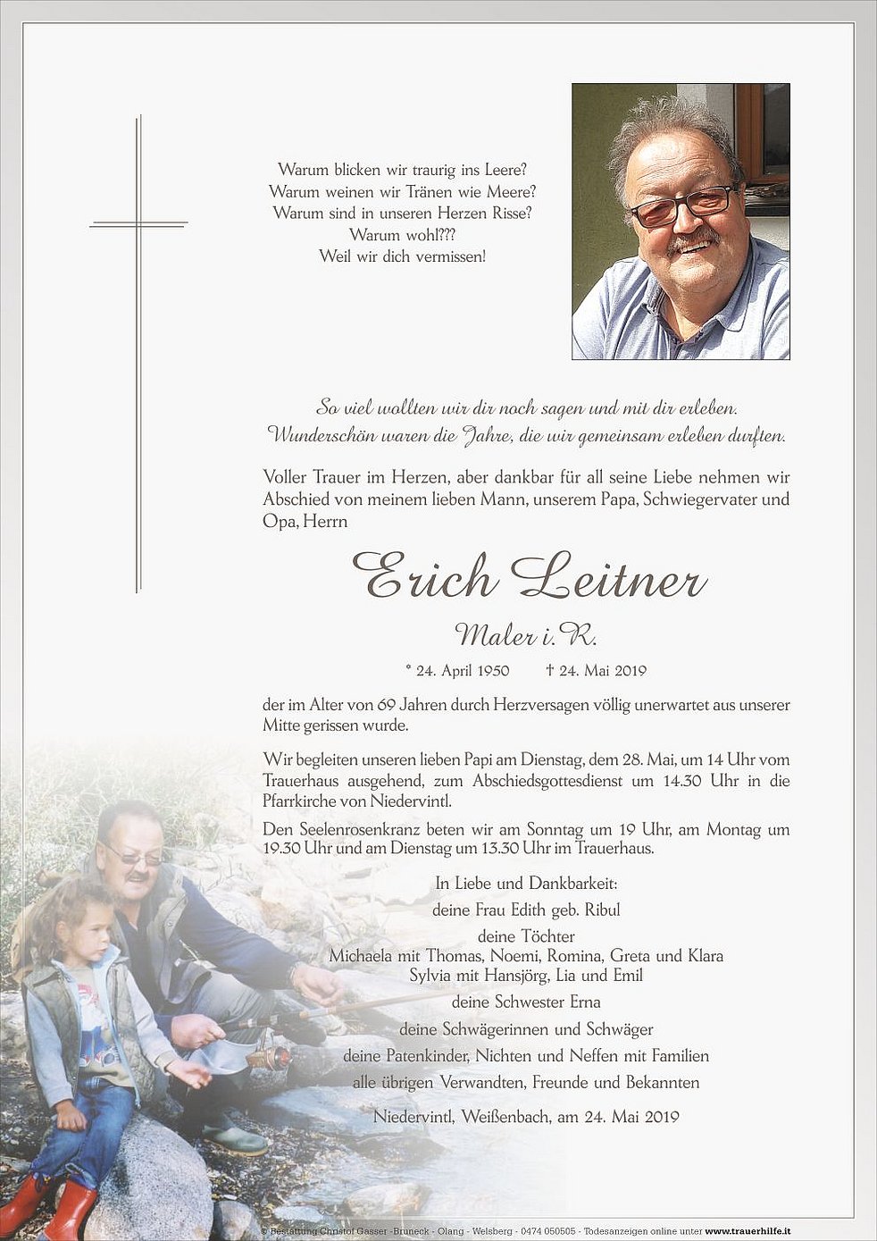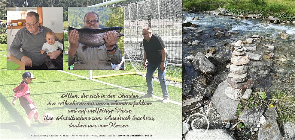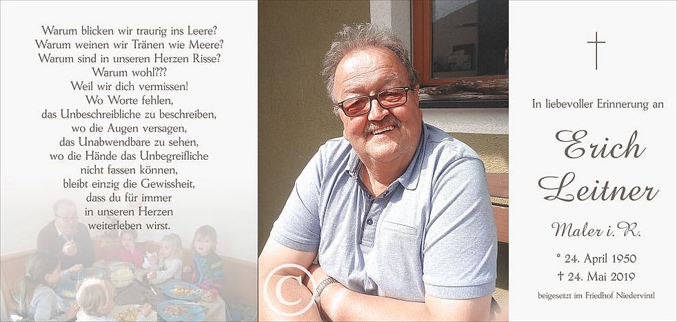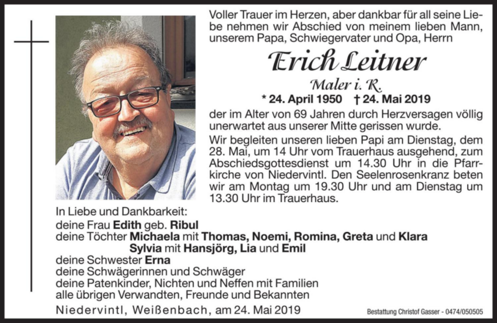 Wir begleiten unseren lieben Papi am Dienstag, dem 28. Mai, um 14 Uhr vom Trauerhaus ausgehend, zum Abschiedsgottesdienst um 14.30 Uhr in die Pfarrkirche von Niedervintl.
