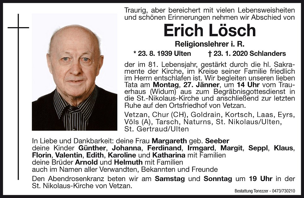 Wir begleiten unseren lieben Tata am Montag, 27. Jänner, um 14 Uhr vom Trauerhaus (Widum) aus zum Begräbnisgottesdienst in die St.-Nikolaus-Kirche und anschließend zur letzten Ruhe auf den Ortsfriedhof von Vetzan.