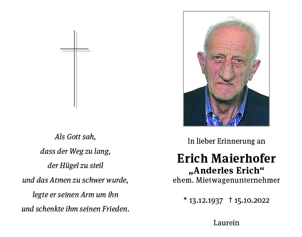 Wir begleiten unseren lieben Verstorbenen am Mittwoch, dem 19. Oktober um 14.30 Uhr von der Leichenkapelle ausgehend zum Trauergottesdienst in die Pfarrkirche von Laurein.