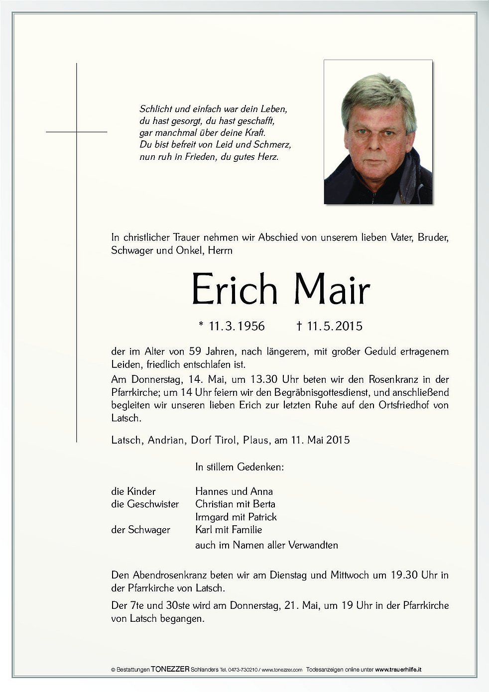 Am Donnerstag, 14. Mai, um 13.30 Uhr beten wir den Rosenkranz in der Pfarrkirche; um 14 Uhr feiern wir den Begräbnisgottesdienst, und anschließend begleiten wir unseren lieben Erich zur letzten Ruhe auf den Ortsfriedhof von Latsch.