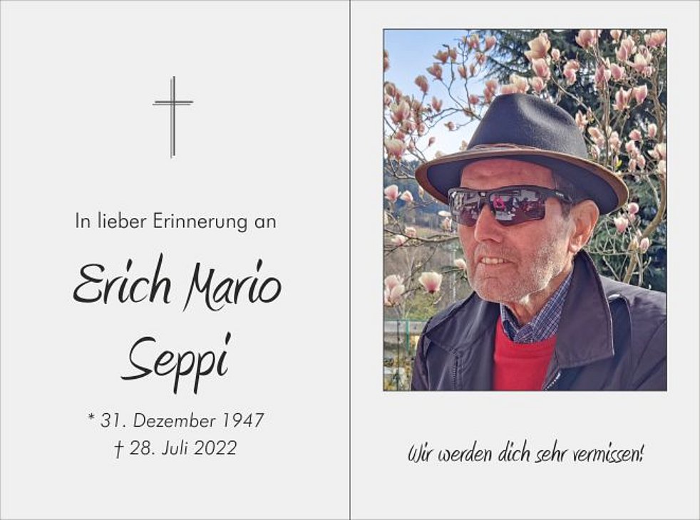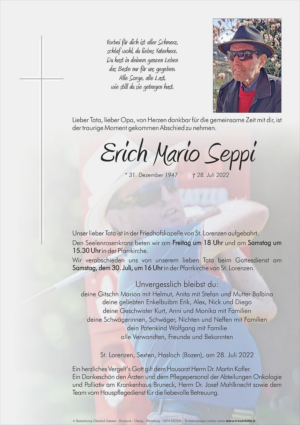Wir verabschieden uns von unserem lieben Tata beim Gottesdienst am Samstag, dem 30. Juli, um 16 Uhr in der Pfarrkirche von St. Lorenzen.