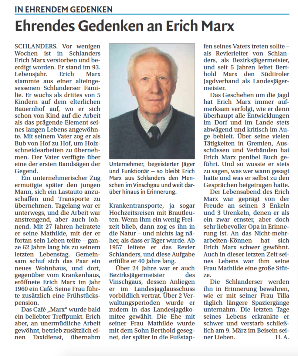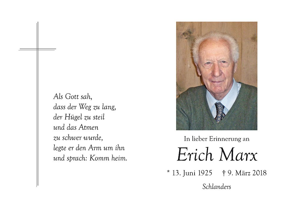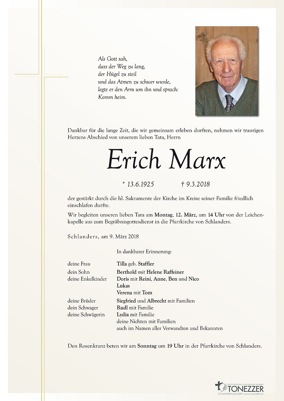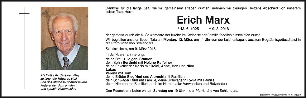 Wir begleiten unseren lieben Tata am Montag, 12. März, um 14 Uhr von der Leichenkapelle aus zum Begräbnisgottesdienst in die Pfarrkirche von Schlanders.