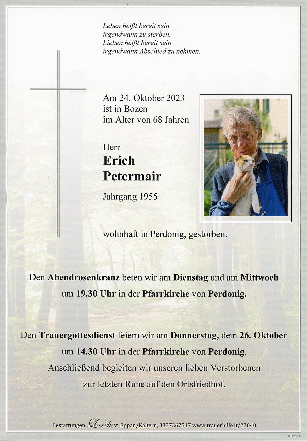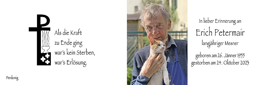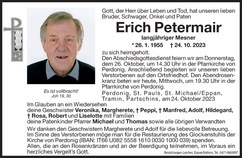 Im Sinne des Verstorbenen möge man für die Restaurierung des Glockenstuhls von Perdonig (IBAN: IT66 U082 5558 1610 0030 1000 039) spenden.