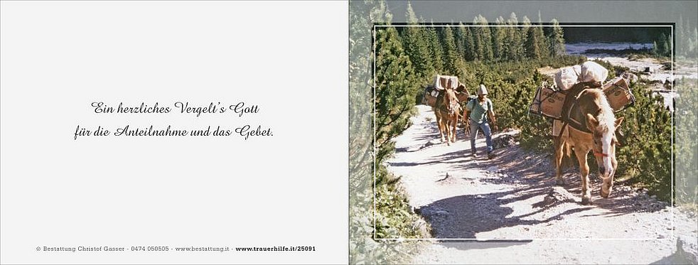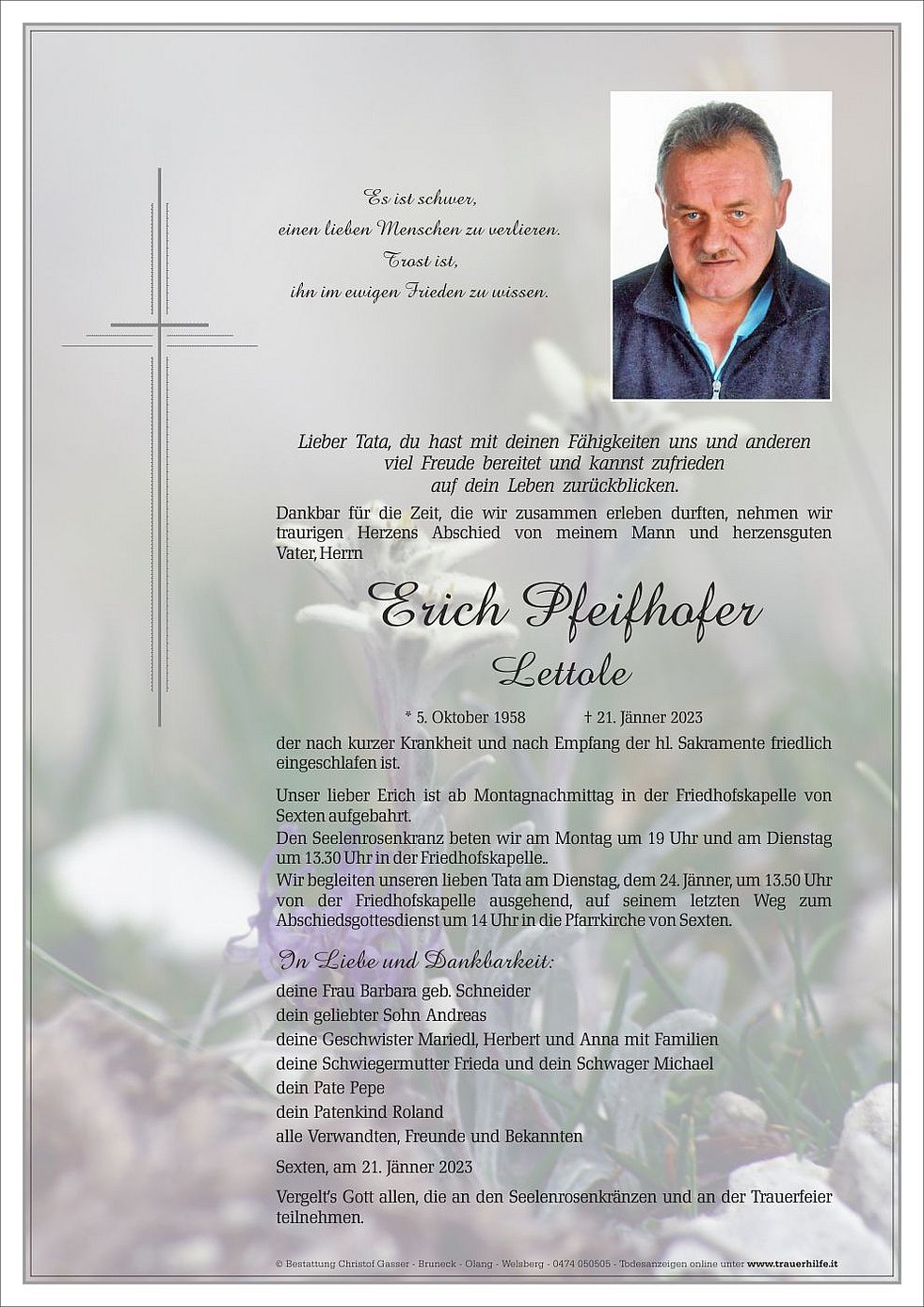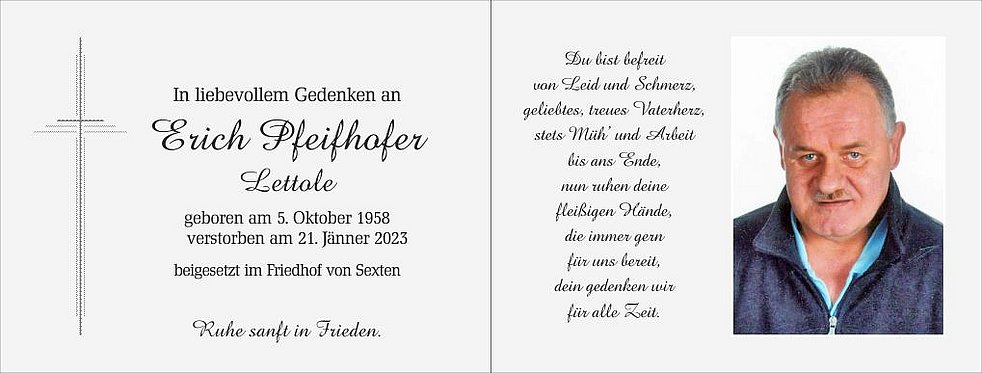 Wir begleiten unseren lieben Tata am Dienstag, dem 24. Jänner, um 13.50 Uhr von der Friedhofskapelle ausgehend, auf seinem letzten Weg zum Abschiedsgottesdienst um 14 Uhr in die Pfarrkirche von Sexten.