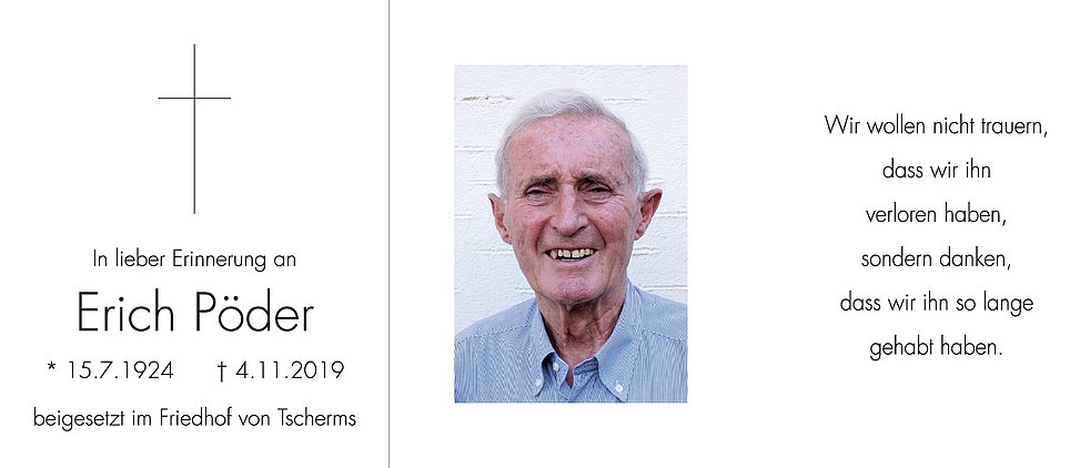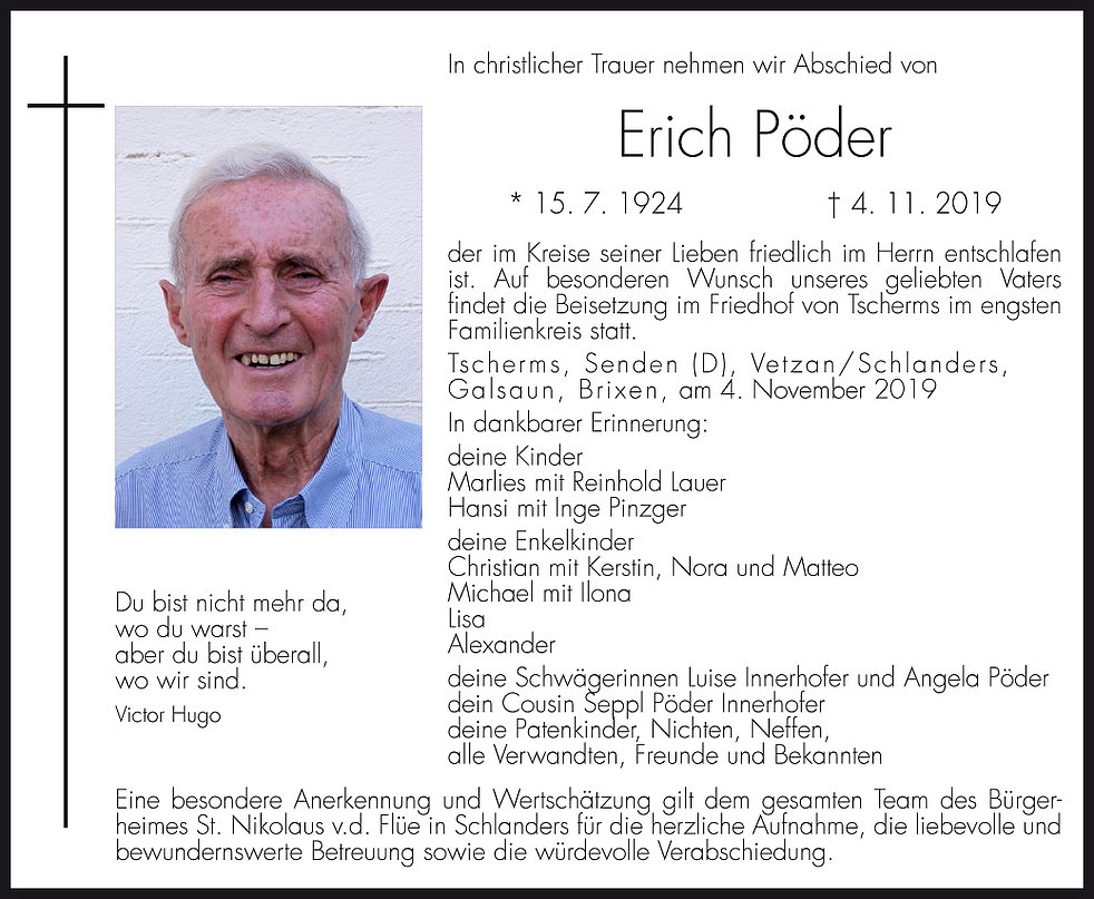 Auf besonderen Wunsch unseres geliebten Vaters findet die Beisetzung im Friedhof von Tscherms im engsten Familienkreis statt.