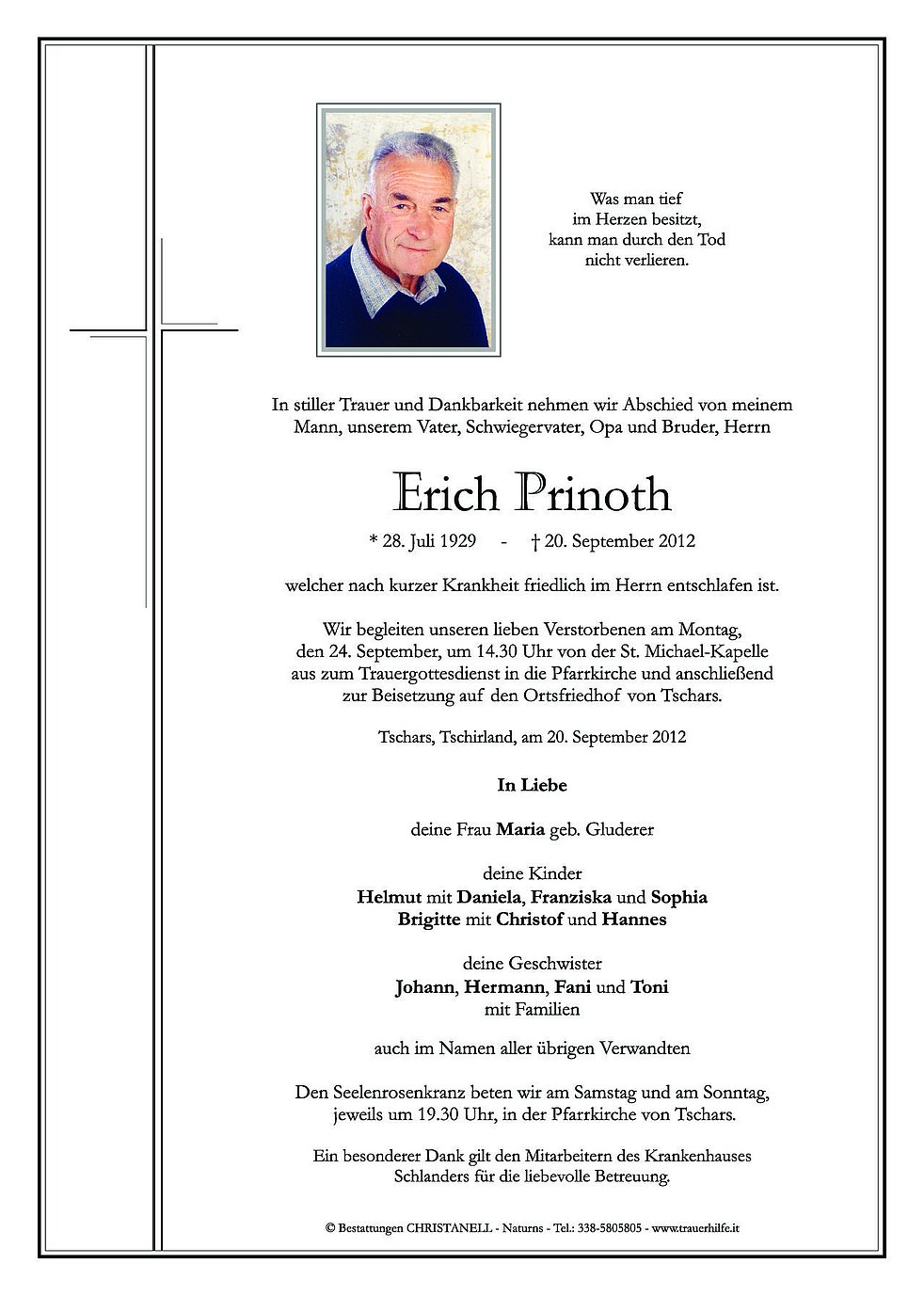 Wir begleiten unseren lieben Verstorbenen am Montag, den 24. September, um 14.30 Uhr von der St. Michael-Kapelle aus zum Trauergottesdienst in die Pfarrkirche und anschließend zur Beisetzung auf den Ortsfriedhof von Tschars.