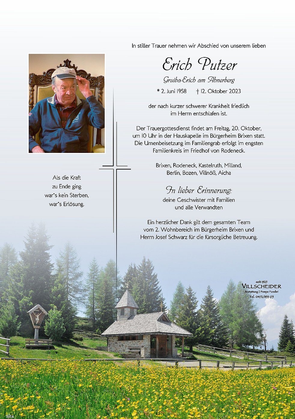 Trauerfeier: 20.10. - 10:00 Uhr Hauskapelle vom Bürgerheim Brixen