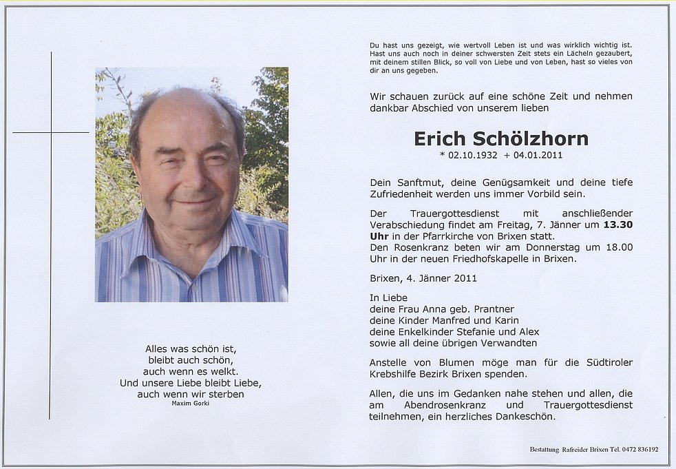 Anstelle von Blumen möge man für die Südtiroler Krebshilfe Bezirk Brixen spenden.