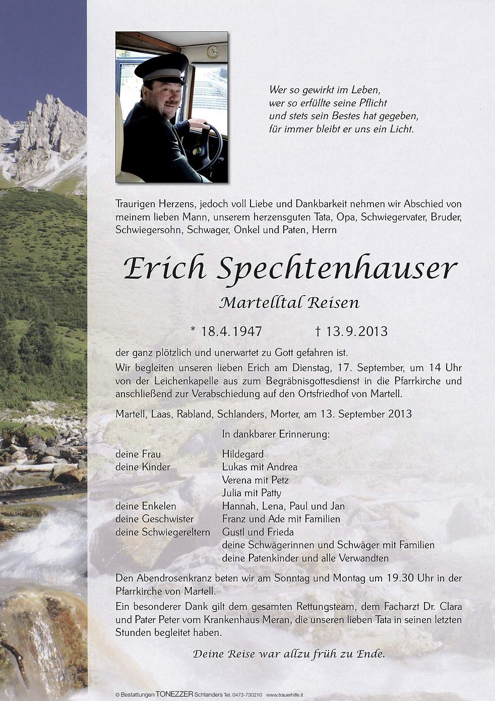 Ein besonderer Dank gilt dem gesamten Rettungsteam, dem Facharzt Dr. Clara und Pater Peter vom Krankenhaus Meran, die unseren lieben Tata in seinen letzten Stunden begleitet haben.