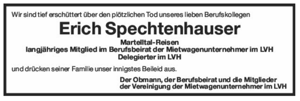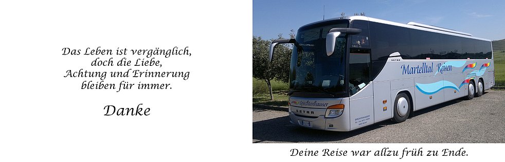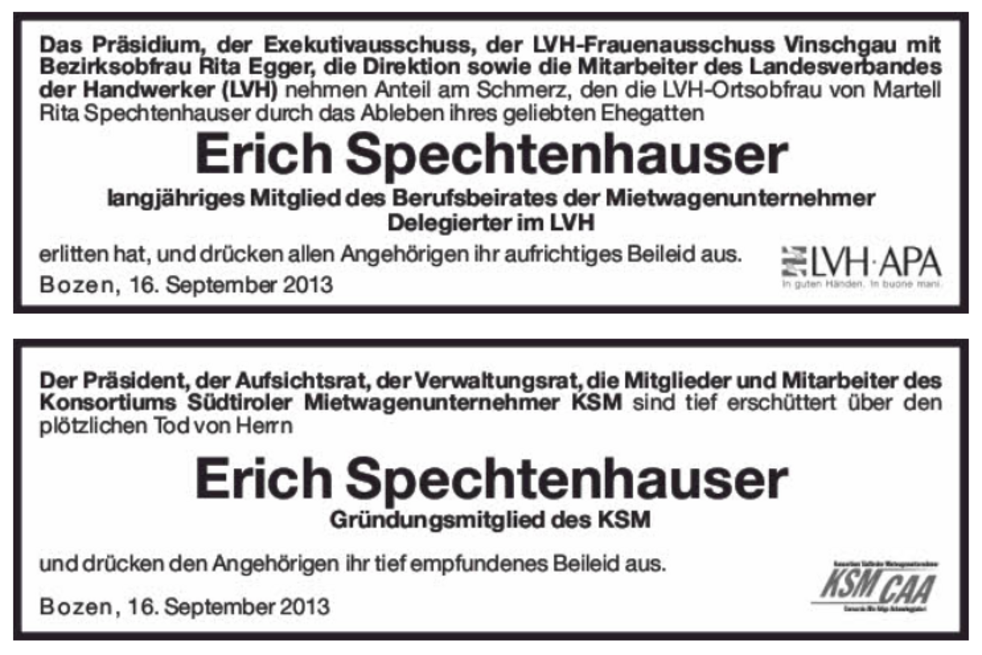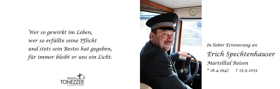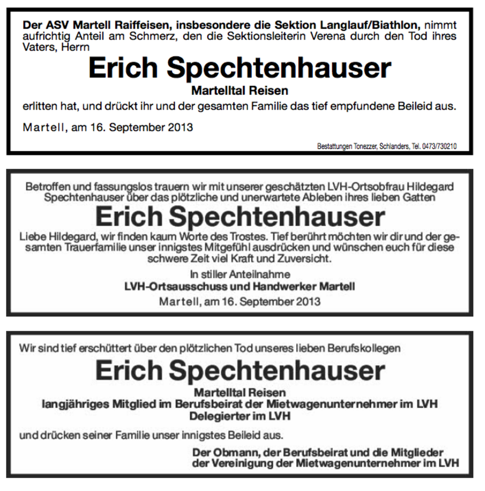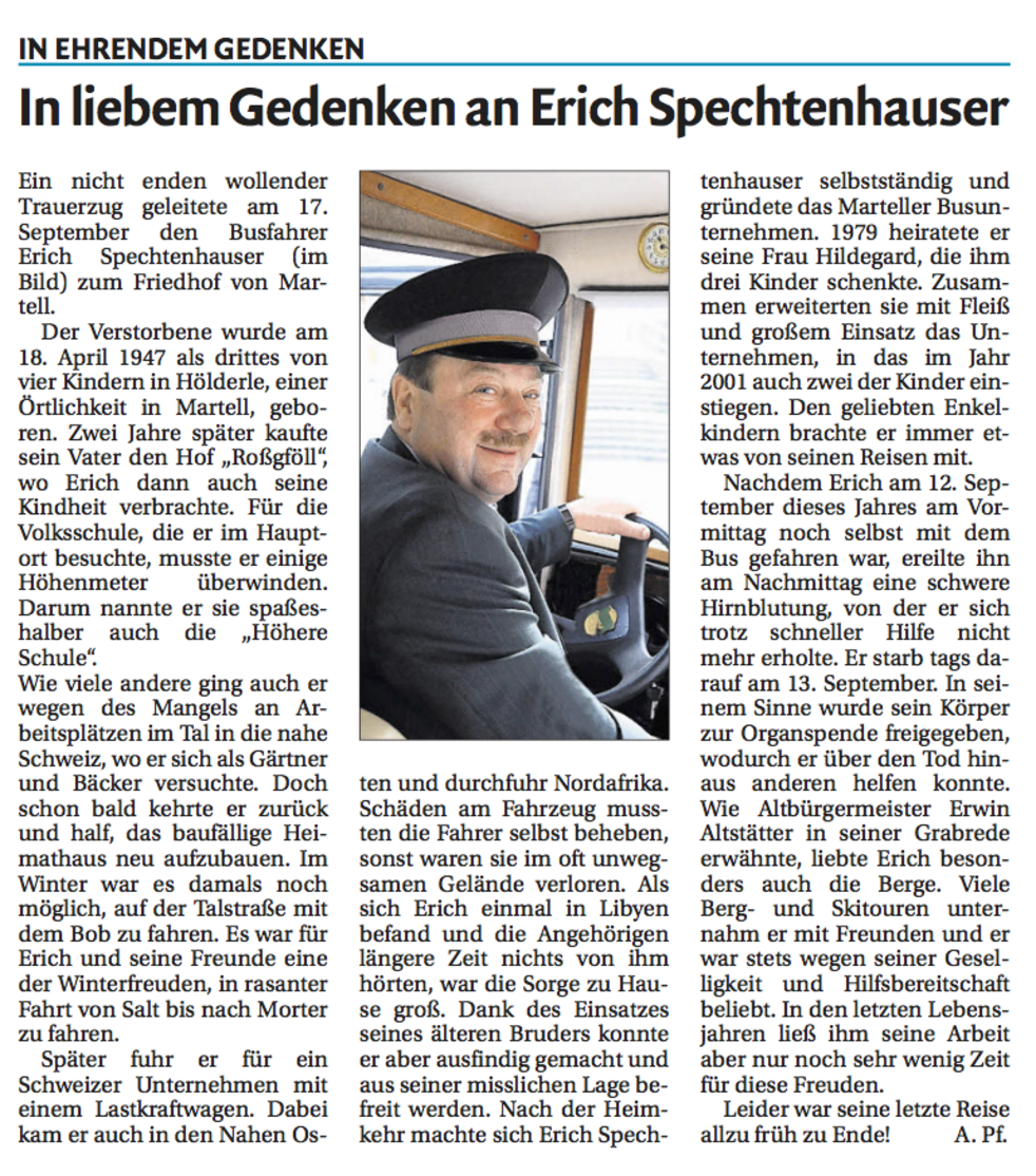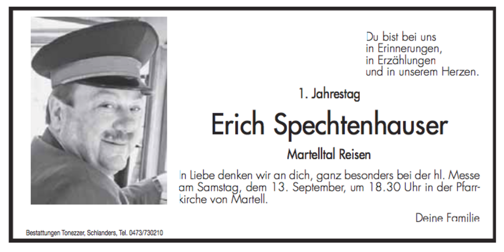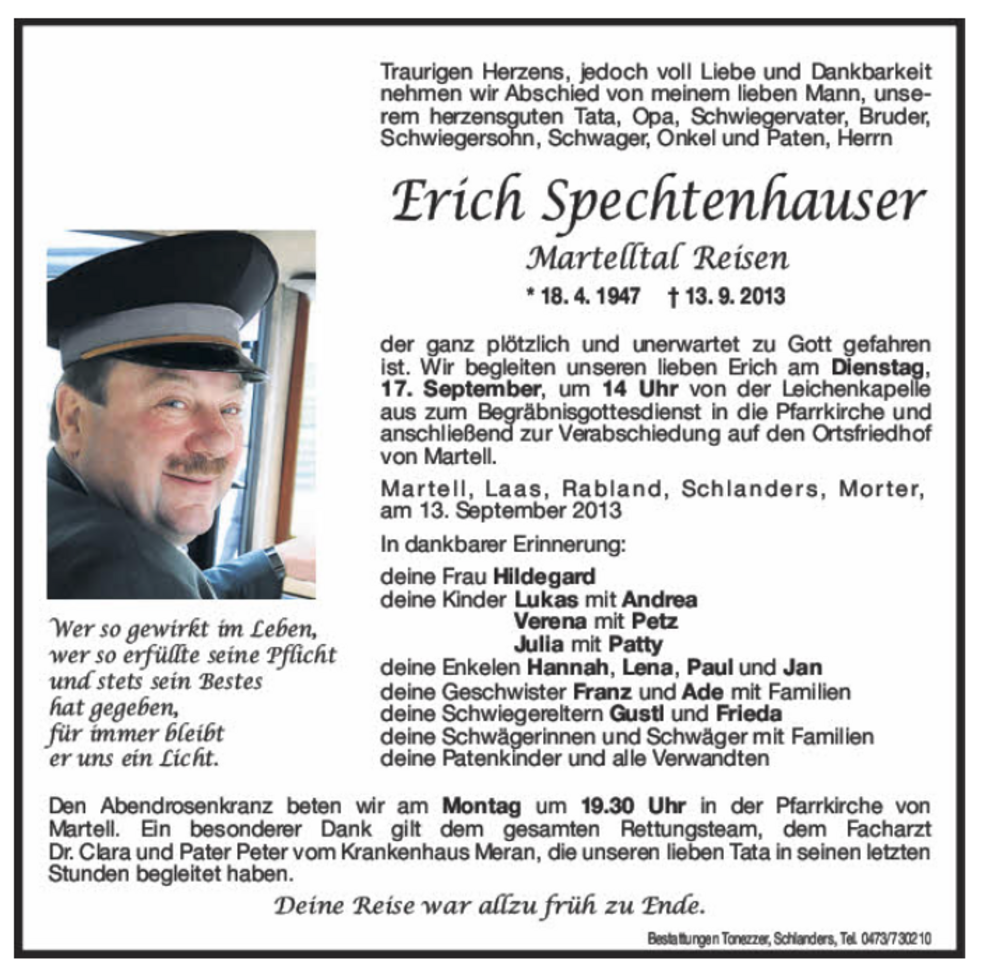 Wir begleiten unseren lieben Erich am Dienstag, 17. September, um 14 Uhr von der Leichenkapelle aus zum Begräbnisgottesdienst in die Pfarrkirche und anschließend zur Verabschiedung auf den Ortsfriedhof von Martell.