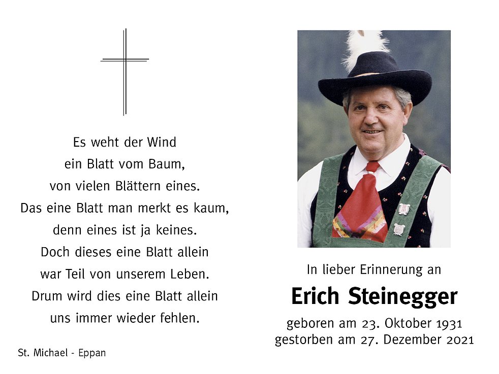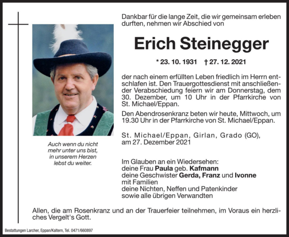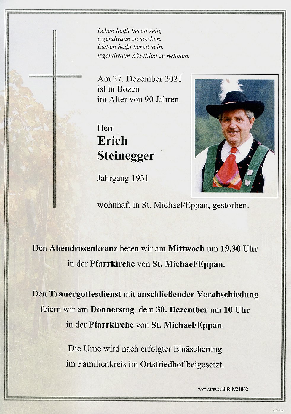 Den Trauergottesdienst mit anschließender Verabschiedung feiern wir am Donnerstag, dem 30. Dezember um 10 Uhr in der Pfarrkirche von St. Michael/Eppan.