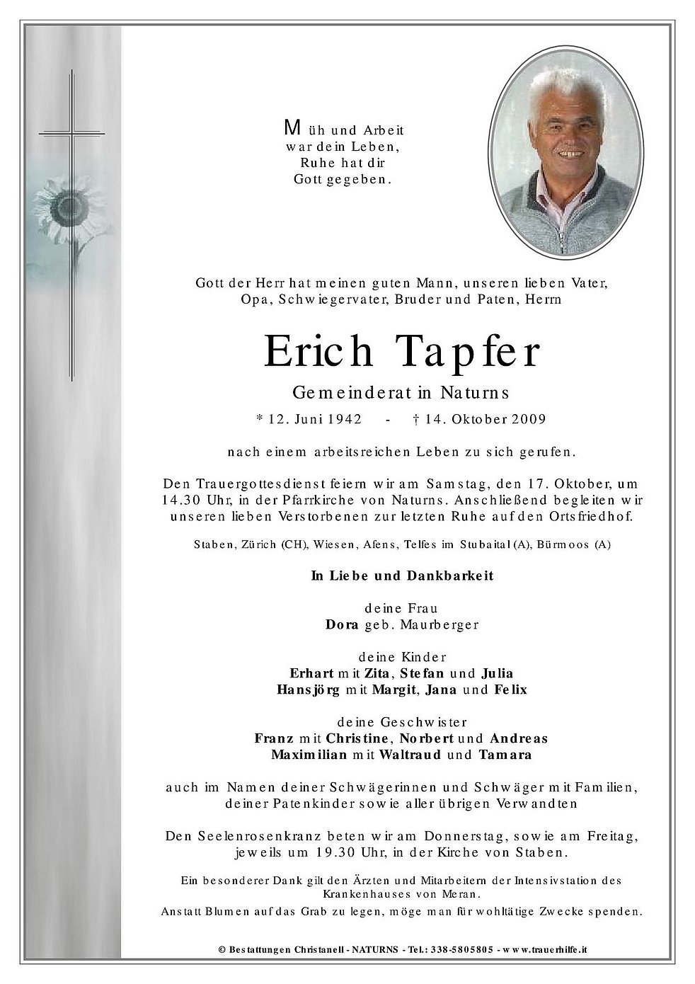 Den Trauergottesdienst feiern wir am Samstag, den 17. Oktober, um 14.30 Uhr, in der Pfarrkirche von Naturns. Anschließend begleiten wir unseren lieben Verstorbenen zur letzten Ruhe auf den Ortsfriedhof.