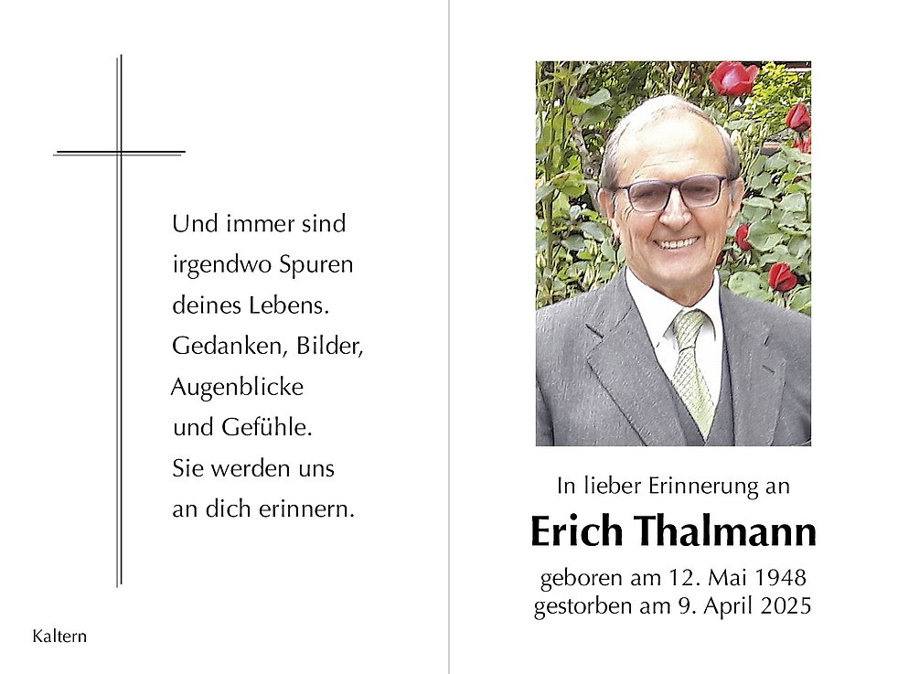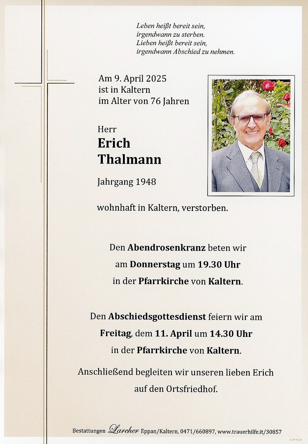 Den Abschiedsgottesdienst feiern wir am Freitag, dem 11. April um 14.30 Uhr in der Pfarrkirche von Kaltern. Anschließend begleiten wir unseren lieben Verstorbenen auf den Ortsfriedhof.