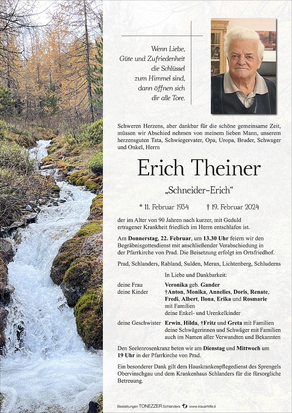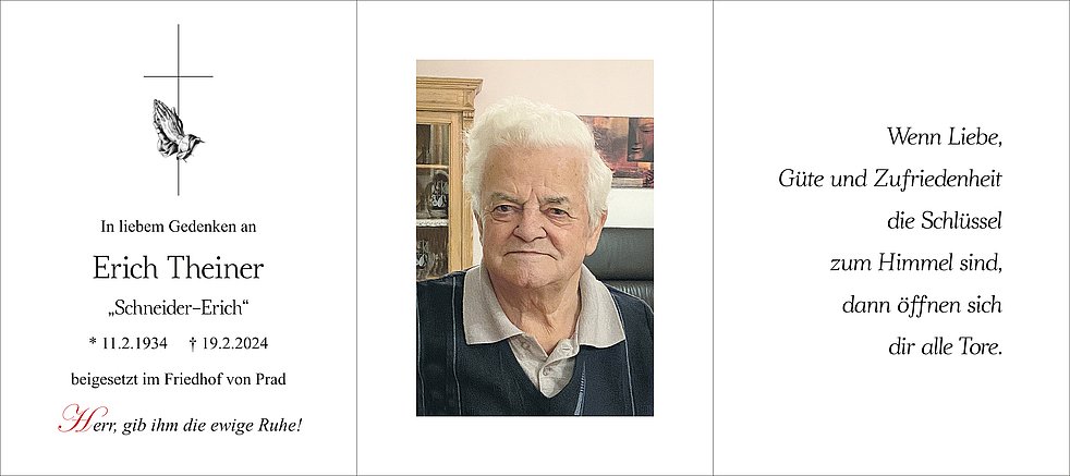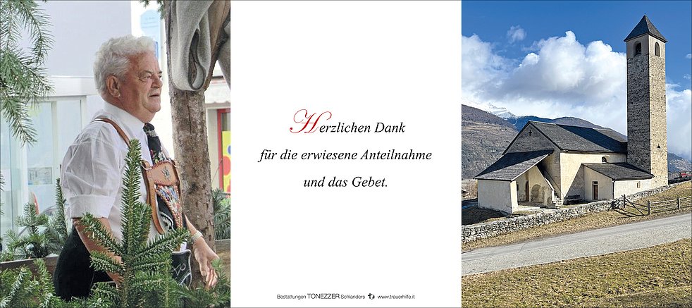 Am Donnerstag, 22. Februar, um 13.30 Uhr feiern wir den Begräbnisgottesdienst mit anschließender Verabschiedung in der Pfarrkirche von Prad. Die Beisetzung erfolgt im Ortsfriedhof.