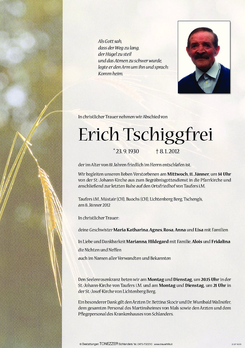 Wir begleiten unseren lieben Verstorbenen am Mittwoch, 11. Jänner, um 14 Uhr von der St.-Johann-Kirche aus zum Begräbnisgottesdienst in die Pfarrkirche und anschließend zur letzten Ruhe auf den Ortsfriedhof von Taufers i.M.