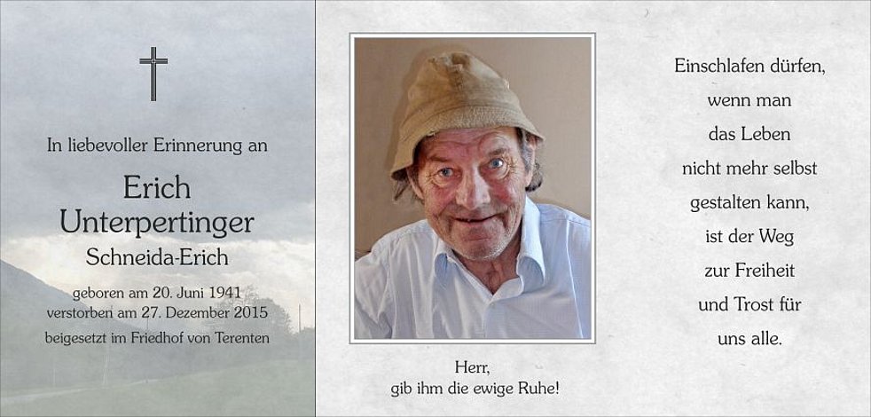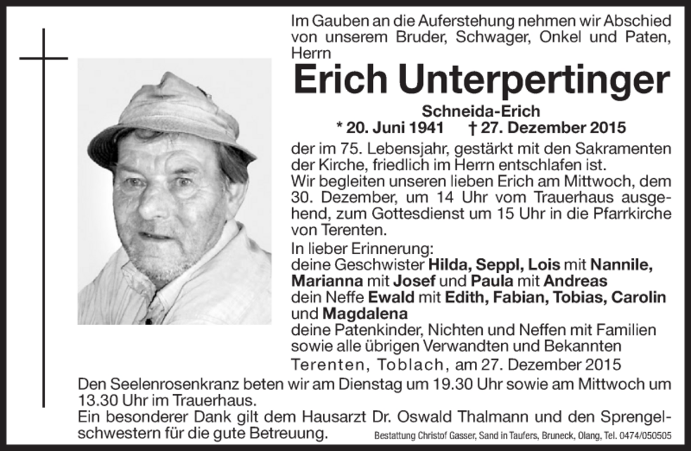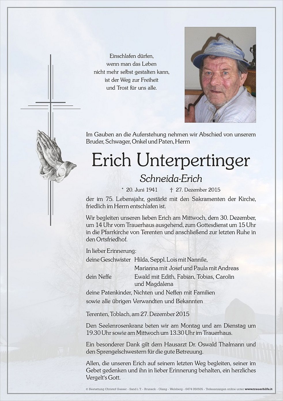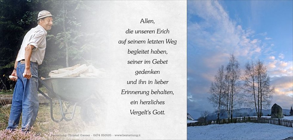 Wir begleiten unseren lieben Erich am Mittwoch, dem 30. Dezember, um 14 Uhr vom Trauerhaus ausgehend, zum Gottesdienst um 15 Uhr in die Pfarrkirche von Terenten und anschließend zur letzten Ruhe in den Ortsfriedhof.