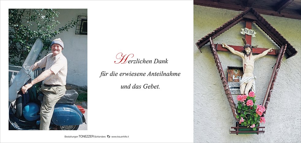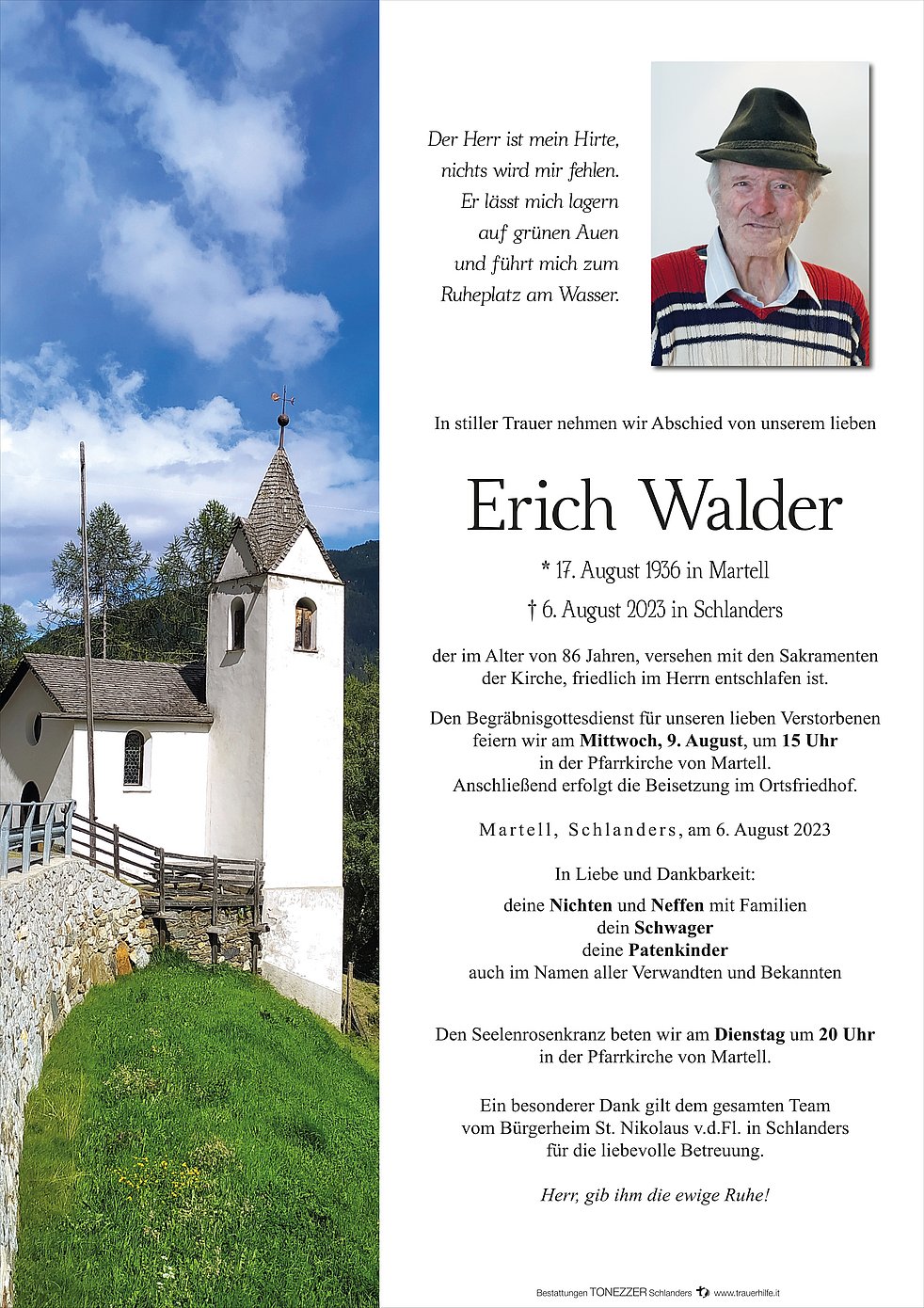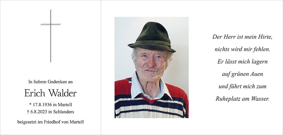 Den Begräbnisgottesdienst für unseren lieben Verstorbenen feiern wir am Mittwoch, 9. August, um 15 Uhr in der Pfarrkirche von Martell. Anschließend erfolgt die Beisetzung im Ortsfriedhof.