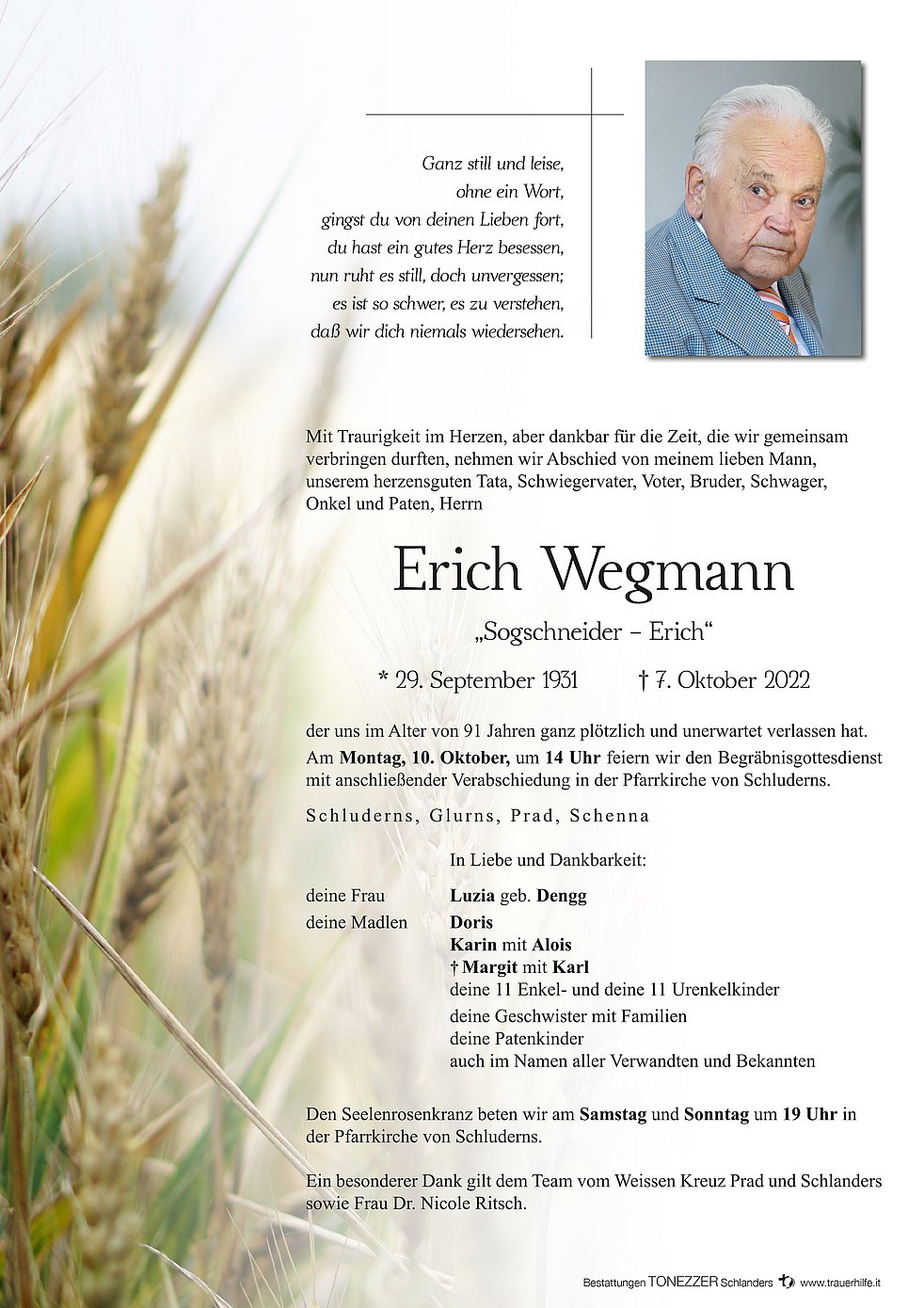 Am Montag, 10. Oktober, um 14 Uhr feiern wir den Begräbnisgottesdienst mit anschließender Verabschiedung in der Pfarrkirche von Schluderns.
