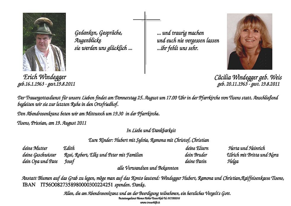 Anstatt Blumen auf das Grab zu legen, möge man auf das Konto lautend: Windegger Hubert, Ramona und Christian,Raiffeisenkasse Tisens,