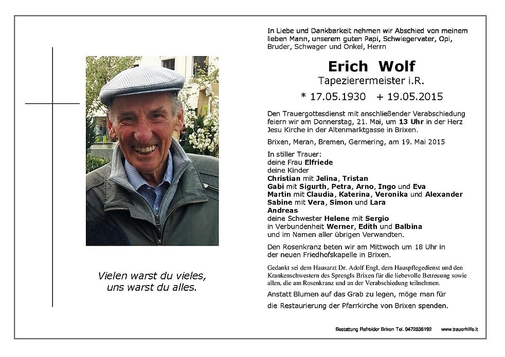 Gedankt sei dem Hausarzt Dr. Adolf Engl, dem Hauspflegedienst und den Krankenschwestern des Sprengls Brixen für die liebevolle Betreuung sowie allen, die am Rosenkranz und an der Verabschiedung teilnehmen.