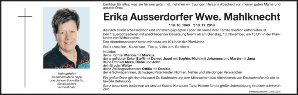 Den Trauergottesdienst mit anschließender Beisetzung feiern wir am Dienstag,