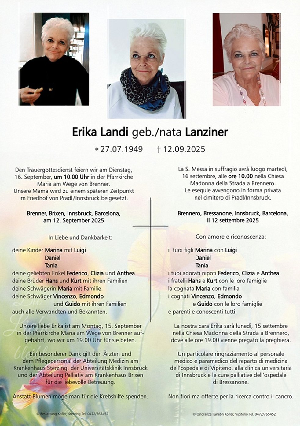 Den Trauergottesdienst feiern wir am Dienstag, 16. September, um 10.00 Uhr in der Pfarrkirche Maria am Wege von Brenner. Unsere Mama wird zu einem späteren Zeitpunkt im Friedhof von Pradl/Innsbruck beigesetzt.