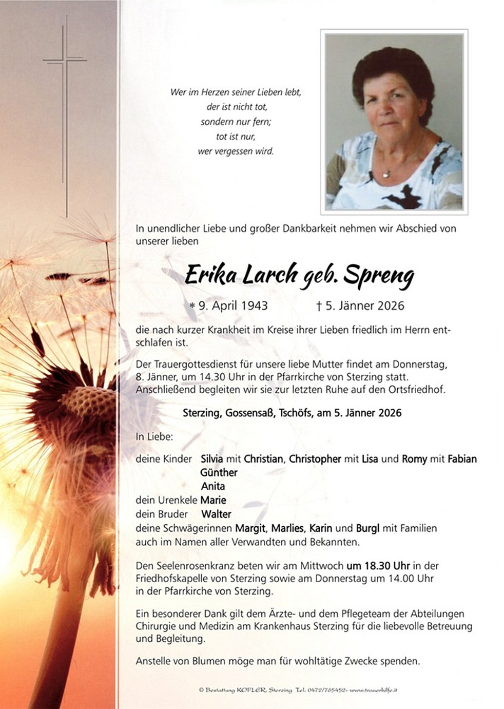 Der Trauergottesdienst für unsere liebe Mutter findet am Donnerstag, 8. Jänner, um 14.30 Uhr in der Pfarrkirche von Sterzing statt. Anschließend begleiten wir sie zur letzten Ruhe auf den Ortsfriedhof.