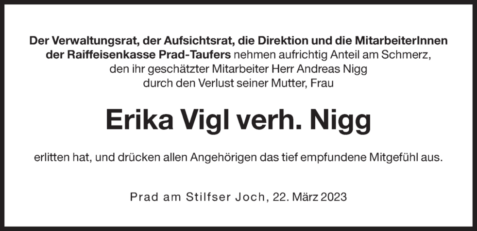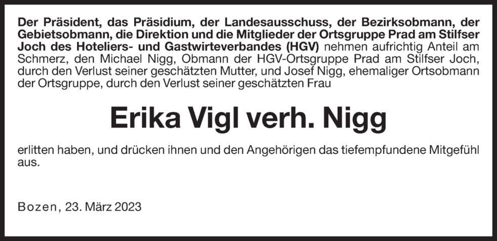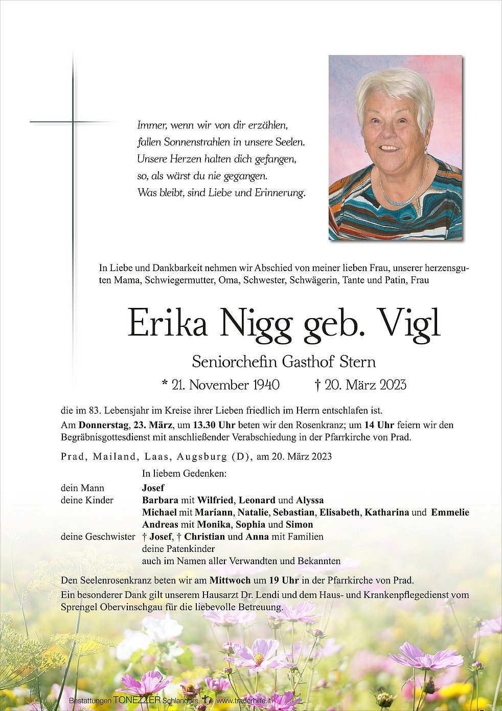 Am Donnerstag, 23. März, um 13.30 Uhr beten wir den Rosenkranz; um 14 Uhr feiern wir den Begräbnisgottesdienst mit anschließender Verabschiedung in der Pfarrkirche von Prad.