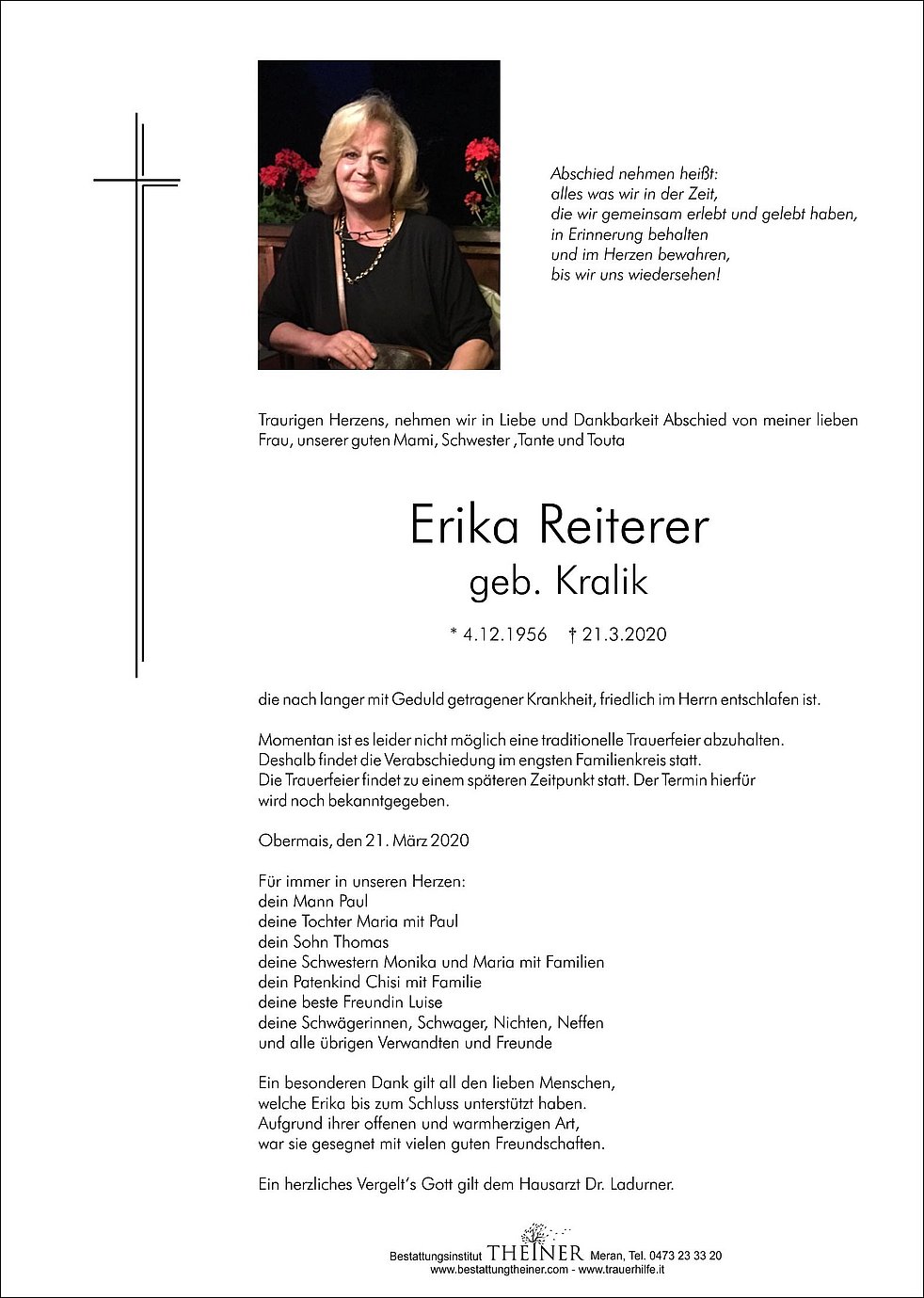 Ein besonderen Dank gilt all den lieben Menschen, welche Erika bis zum Schluss unterstützt haben. Aufgrund ihrer offenen und warmherzigen Art, war sie gesegnet mit vielen guten Freundschaften.