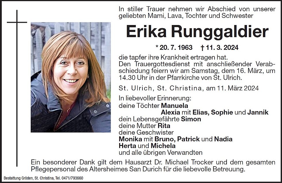 Den Trauergottesdienst mit anschließender Verabschiedung feiern wir am Samstag, dem 16. März, um 14.30 Uhr in der Pfarrkirche von St. Ulrich.