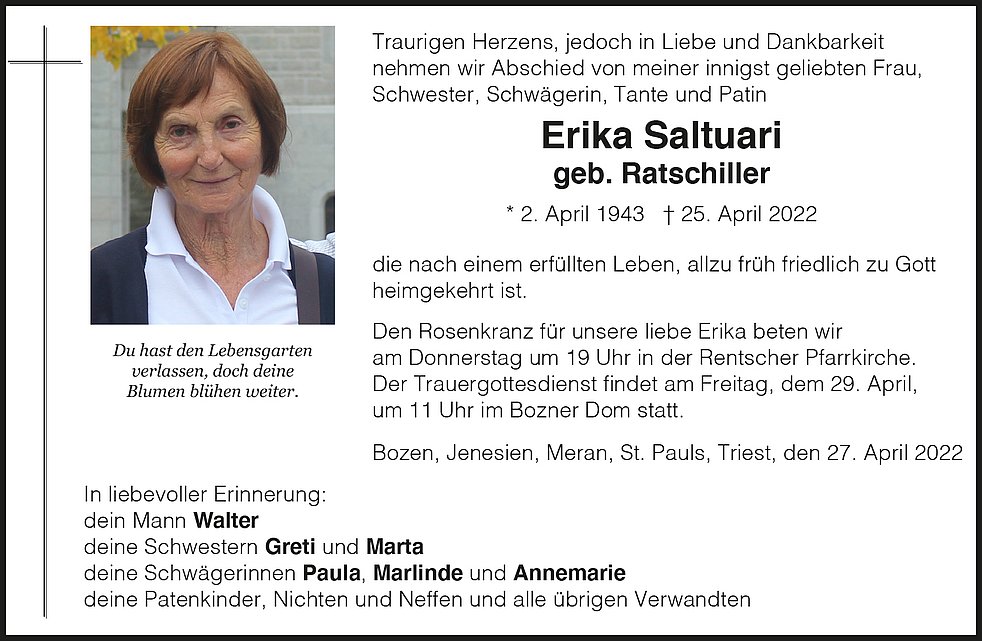 Den Angehörigen unser aufrichtiges Beileid. Wir haben Erika kennengelernt bei vielen Besuchen in Gsies bei Flurbereinigung. Ihre professionelle und freundliche Art und beratung beim "Grassamen" wird uns immer in Erinnerung bleiben. Erika ruhe in Frieden.