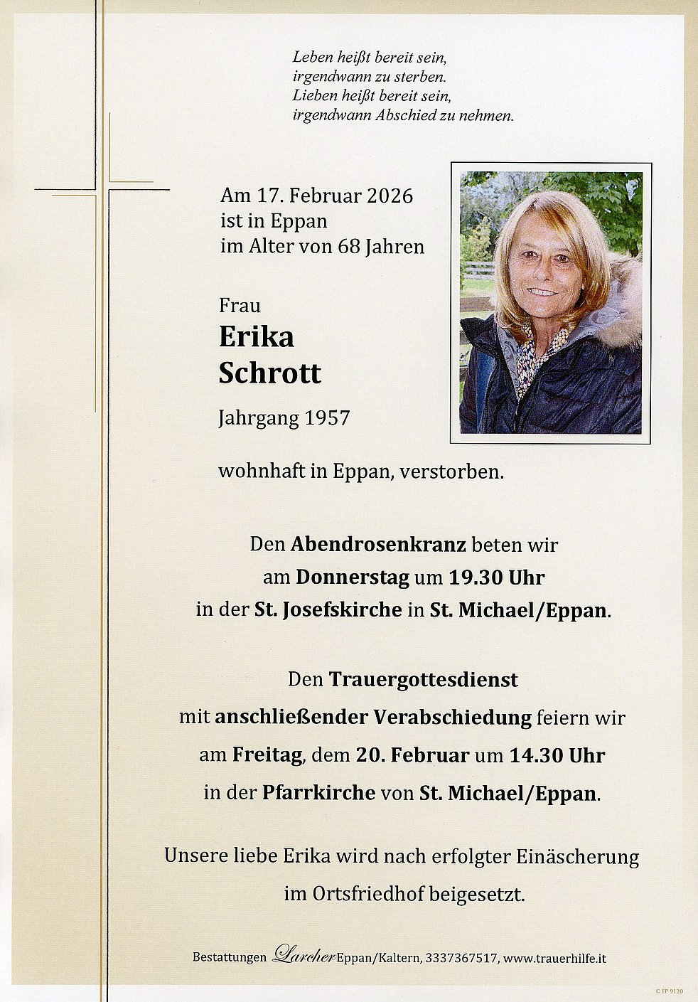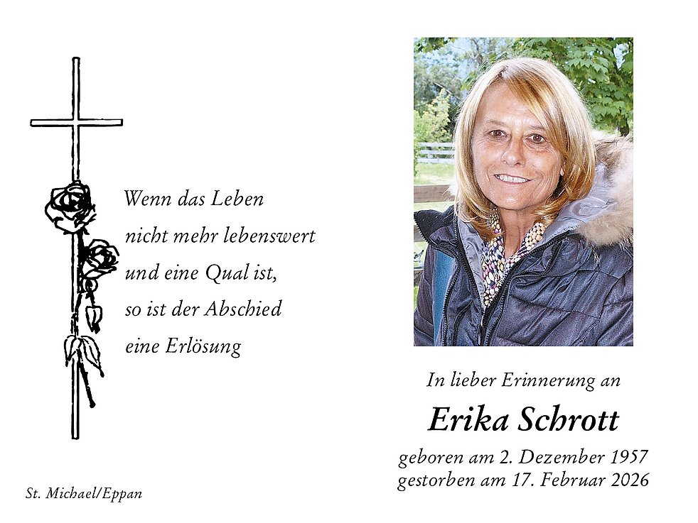 Den Trauergottesdienst mit anschließender Verabschiedung feiern wir am Freitag, dem 20. Februar um 14.30 Uhr in der Pfarrkirche von St. Michael/Eppan.