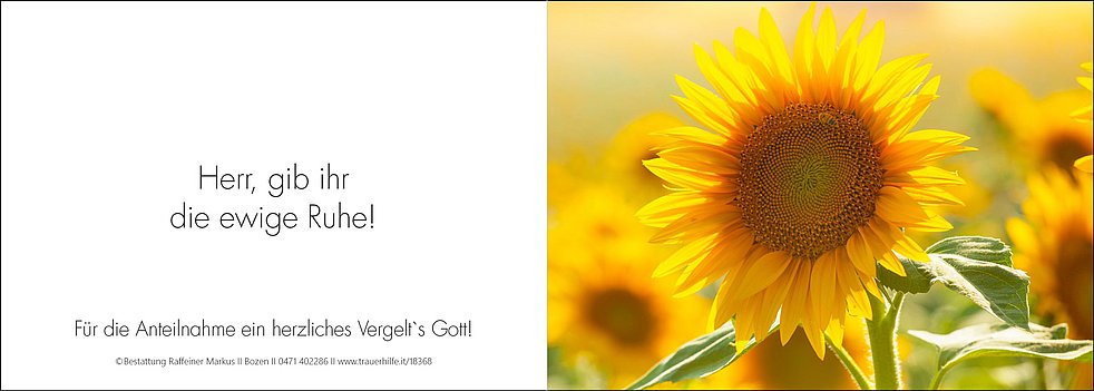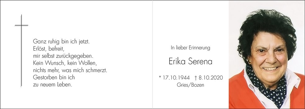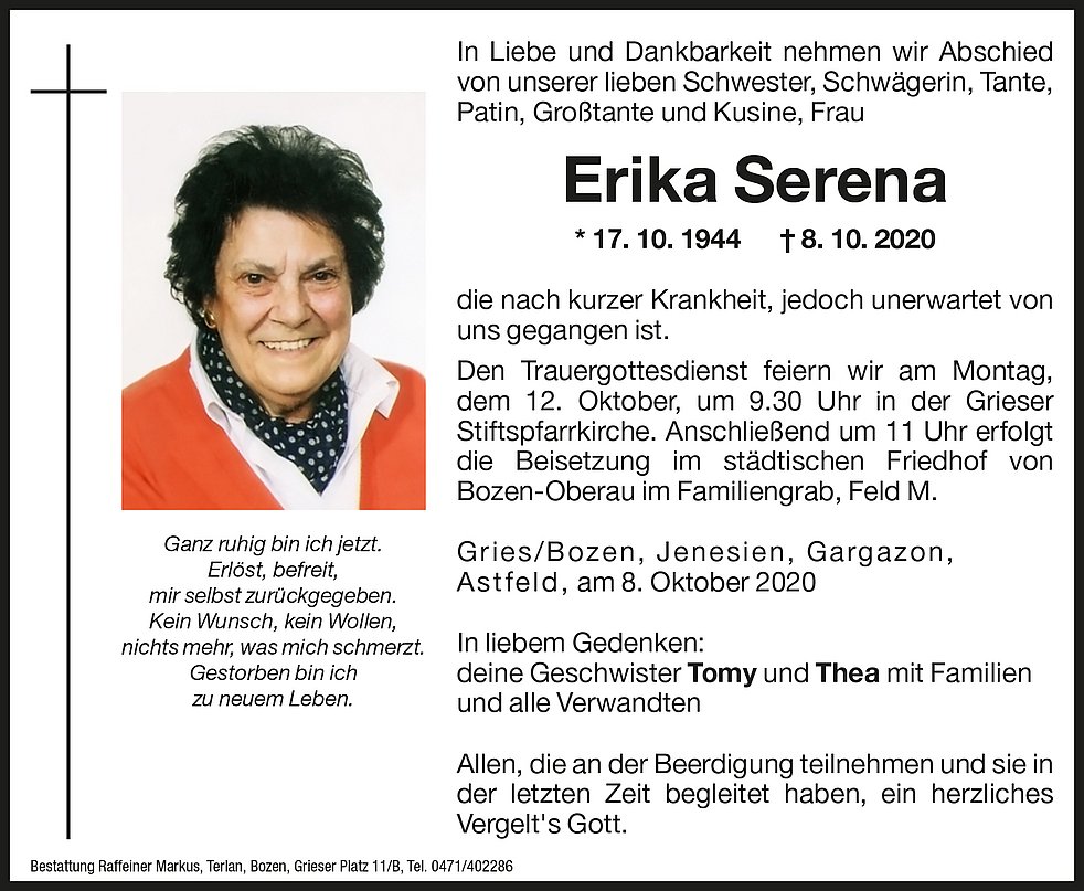 Den Trauergottesdienst feiern wir am Montag, dem 12. Oktober, um 9.30 Uhr in der Grieser Stiftspfarrkirche. Anschließend um 11 Uhr erfolgt die Beisetzung im städtischen Friedhof von Bozen-Oberau am Familiengrab, Feld M